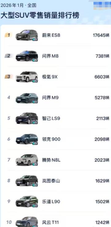 开车回家过年,我有一个感觉,路上的国产新能源车型是越来越多了。 而且,高端国产车型的可见度也远远超出前几年。 刚刚了解了一下,蔚来全新ES8在1月份销量达到了17645辆,连续两个月斩获大型SUV销量冠军,而且,这个冠军还是不分能源形式、不分价格区间、不分座位数。 2月1日的时候,蔚来全新ES8交付突破6万辆,仅用了134天,这个速度可以说是相当惊人了。 要知道,这可是一款40.68万元起售的豪华车型。 中国的消费者有两大特征,第一,非常挑剔,因为见过的好车实在太多,平常“吃得太好”;第二,非常识货,不见好车是不掏腰包的。 能让消费者忘记BBA,这肯定与蔚来全新ES8的强大性能有关,颜值、空间、配置、智能化、动力系统、安全性能都得领先同级别对手。 春节这段时间,也是车主集中分享用车体验的高峰时段,口碑传播很快。 年后,蔚来会不会更上一层楼呢?【来自懂车帝车友圈】