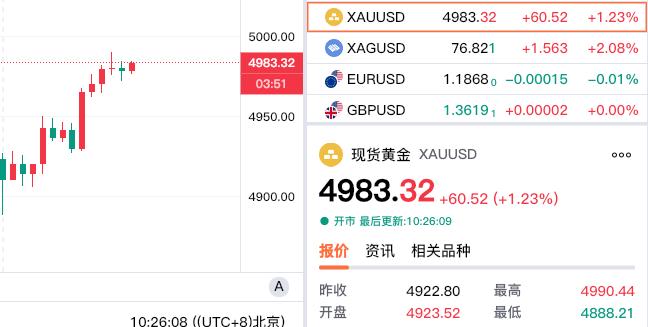 今日探底回升, 有所企稳走强。 现货黄金报价4983.32美元, 较昨日上涨60.52美金。 对于现货黄金来说, 今天是节前国内 最后一个交易日, 现货黄金走强,站上五千概率比较大!