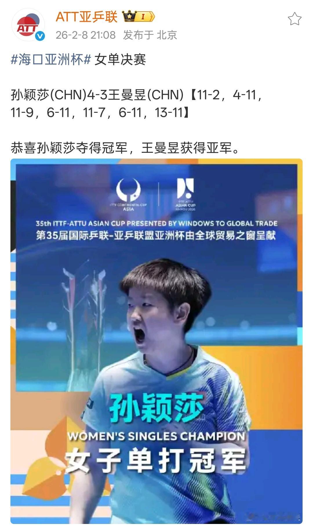 孙颖莎 洛杉矶周期截止到2026.2.8孙颖莎已收获国际赛事女单冠军9️⃣冠🏆