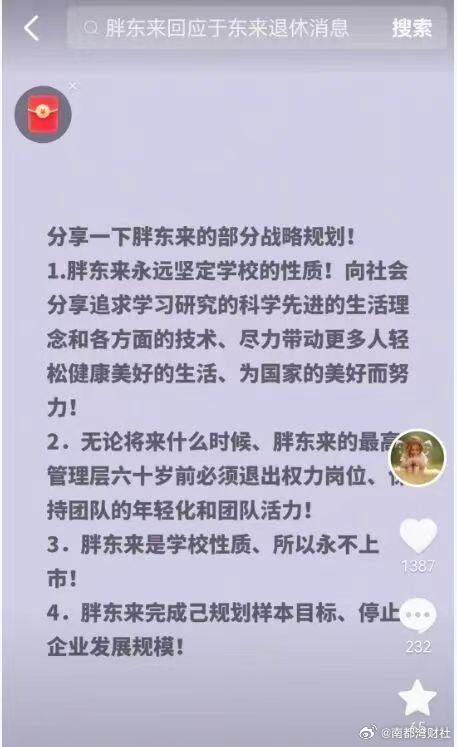 #胖东来最高管理层60岁前退休#【#于东来称胖东来将永不上市#】#胖东来永不上市# 2月12日晚,胖东来创始人于东来在社交媒体发布胖东来的部分战略规划,称胖东来永远坚定学校的性质,所以“永不上市”。同时,于东来称无论将来什么时候,胖东来的最高管理层六十岁前必须退出权力岗位,保持团队的年轻化和团队活力。此外,于东来还提到,胖东来完成规划样本目标,停止企业发展规模。(财联社)