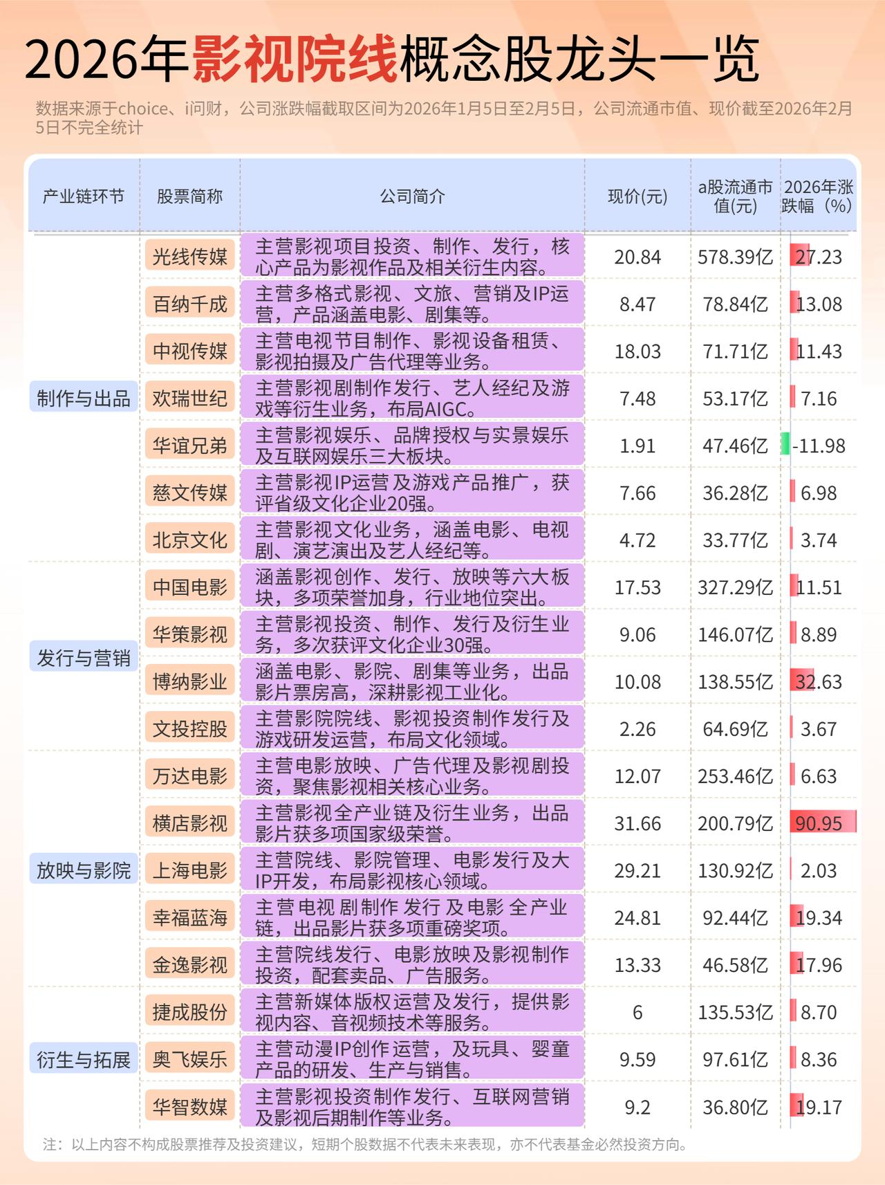 2026年影视院线概念一览表(建议收藏) (向右滑动图片查看完整名单) 影视院线概念近期热度上涨,市场关注度提高! 消息面上,数据显示,目前已有7部影片定档春节期间,其中,有6部均在大年初一上映。另外,截止2026年1月31日,预计2月共将上映新片17部。 影视院线行业介绍 中国电影市场在2025年展现出强劲的复苏势头,根据猫眼数据显示,2025年全国电影总票房达到518.31亿元,同比增长21.9%;观影人次为12.37亿,同比增长22.6%。 1、市场与产业化情况 对于即将到来的2026年春节档,市场该档期迎来了“史上最长”的9天假期,为票房释放提供了更充裕的时间。针 根据票房探照灯的调研结果显示,按传统的初一至初七总票房进行预估,有34.3%的受访者认为2026年春节档总票房将落在70亿至80亿元区间,同时,认为能突破80亿元的合计占比约33.5%,显示出行业对档期大盘的乐观预期。 虽然由于2025年《哪吒之魔童闹海》创造了95亿的春节档历史高基数,市场普遍预期2026年票房同比或有所回落,但基于多元的影片供给和长假效应,业内仍看好其具备催化效应。 2、机构观点 各大券商研究机构对影视院线行业的观察,主要聚焦于短期档期催化与中长期产业趋势两个方面。对2026年春节档的预测与看法: 中金公司预计,在保守、中性、乐观情形下,2026年春节档含服务费票房分别约为65亿元、75亿元和85亿元。该机构也指出,由于定档时间偏晚及高基数影响,档期票房可能同比回落。 中信建投证券明确表示看好2026年春节档表现,主要理由是假期时间更长、头部电影资源集中。其研报指出,春节档已定档《飞驰人生3》《熊出没·年年有熊》等高票房IP续作,后续当时还有重磅影片待定档。 华源证券、华鑫证券和广发证券均在研报中提及2026年春节档影片定档情况,认为多元题材有望承接不同观众需求。