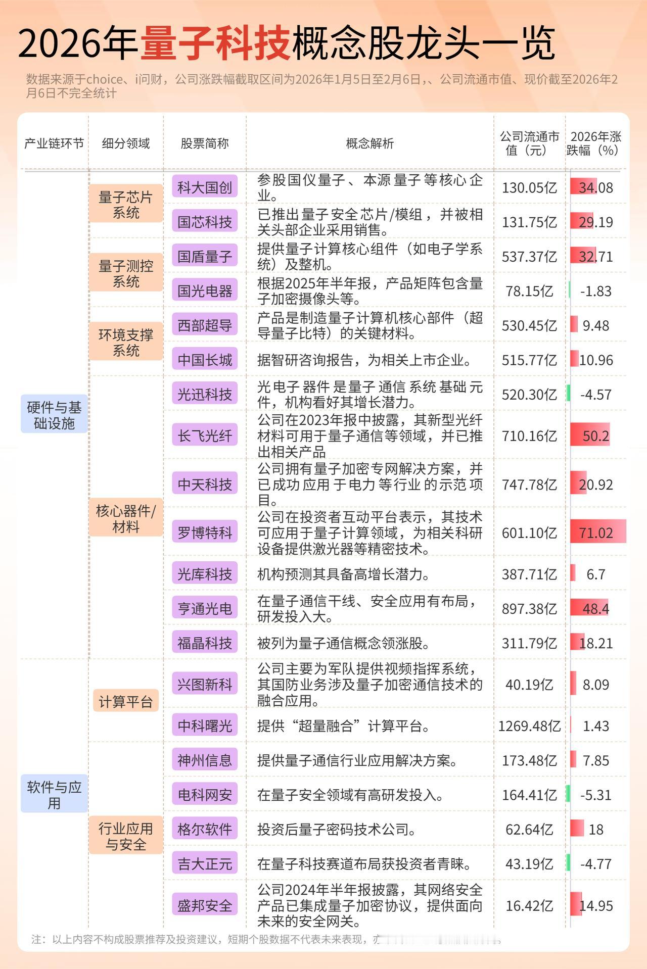 2026年量子科技概念股一览表(建议收藏) (向右滑动图片查看完整名单) 量子科技概念近期热度上涨,市场关注度提高! 消息面上,据中国科学技术大学消息,该校潘建伟院士团队在可扩展量子网络研究方面取得重大突破,标志着基于量子纠缠的光纤量子网络正在从理论构想走向现实可能,进一步扩大了我国在该领域的国际优势。 量子科技概念介绍 1、概念定义 量子技术,是以量子力学的基本原理为基础,利用量子叠加、量子纠缠、量子不可克隆等特性,来实现量子计算、量子通信和量子测量。 据新华社报道,面向这一未来,中国已迈出关键步伐。 2025年3月,我国自主研发的量子计算原型机“祖冲之三号”问世,刷新超导体系全球量子计算优越性新纪录。 2025年7月,我国科研团队打造出“纳米双光子工厂”,制备出保真度达99.4%的新型量子纠缠光源,为更先进的量子应用奠定关键基础。 2、市场规模与最新动态 市场规模: 根据国际前沿科技咨询机构ICV TA&K & Quantum China统计,2024年,全球量子科技产业整体规模达80亿美元。 分地区看,其中北美占比31.45%、欧洲占比26.91%、中国占比24.03%、亚太地区(除中国)占比12.74%、其他地区占比4.87%。 中国报告大厅网数据显示,我国量子科技市场规模预计到2029年将增至97.58亿美元。2024年至2029年复合年增长率预估为37.45%。 最新动态: 国际动态方面,量子计算公司IonQ 宣布以18亿美元收购半导体企业 SkyWater,旨在实现从量子设计、制造到封装的垂直产业链整合。根据计划,IonQ 预计在2028年启动20万量子比特的量子处理单元功能测试,该平台可支持高达8000个超高保真逻辑量子比特。与此同时,其200万量子比特芯片的研发进程也比原计划提前了一年。 国内动态方面,一支中国科研团队利用自主研制的78比特超导量子芯片“庄子2.0”,在量子模拟器上首次系统研究了超越周期(准周期)的随机驱动下的可调预热化现象,为通过人工驱动调控量子系统开拓了新的路径。该项研究成果已于1月28日发表在《自然》杂志上。 私募排排网量子科技什么是量子科技量子科技\量子科技概念股量子科技概念股票交流今日A股概念股梳理股票财经A股市场概念股