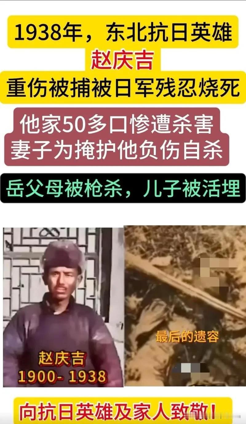 1938年,赵庆吉将军因受伤被俘,他拒绝投降,临刑前仍大骂日军及汉奸,英勇就义。赵庆吉妻子在战斗中牺牲,亲属、儿子等50多人被枪杀、活埋。 赵庆吉出生于辽宁岫岩的普通家庭,年少时便见惯了日寇在东北土地上的横行霸道,百姓被肆意欺压、家园被无端践踏的场景,让他从心底燃起了抗日救国的信念。 东北沦陷后,他不愿做亡国奴,毅然放弃安稳的生活,散尽家中积蓄联络当地的爱国志士,拉起一支抗日武装队伍,投身到反抗日寇侵略的斗争中。 他作战勇猛且指挥有方,带领队伍在辽南山区辗转作战,多次突袭日伪据点,切断敌人的补给线路,给当地的日寇势力造成了极大的打击,也成为日寇眼中必须拔除的眼中钉。 妻子关世英是与他志同道合的革命伴侣,深知丈夫的抗日理想,也明白民族危亡之际人人有责,她主动告别家中安稳的生活,跟随赵庆吉奔赴战场。 关世英没有丝毫女子的柔弱,在队伍里刻苦学习射击、战术等战斗技能,跟着队伍一起行军、作战、掩护百姓,很快成长为能独当一面的抗日战士。 夫妻二人在战场上相互扶持、配合默契,带领着队伍一次次突破日寇的围剿,守护着当地百姓的生命安全,他们的身影成为辽南抗日战场上一道坚定的力量。 长期的敌后抗日斗争本就充满凶险,日寇的围剿行动一次比一次疯狂,动用大量兵力对抗日武装进行拉网式搜捕。 在一次激烈的突围战斗中,关世英为了掩护主力队伍和百姓转移,主动留下阻击敌人,面对数倍于己的日伪军,她毫不畏惧,坚守阵地直至打完最后一颗子弹,最终在战斗中壮烈牺牲。 妻子的离世让赵庆吉承受着巨大的悲痛,可他深知抗日大业尚未完成,只能将悲痛深埋心底,带着妻子的遗志继续带领队伍奋战在抗日一线。 1938年,赵庆吉在一次作战中遭遇日寇重兵包围,激战中他身负数伤,最终因伤势过重失去抵抗能力被日寇俘虏。日寇深知赵庆吉在当地抗日武装中的影响力,妄图通过劝降让他屈服,以此瓦解当地的抗日力量。 日寇摆出高官厚禄的诱惑,承诺只要他放弃抗日、归顺日伪,便能享受荣华富贵,甚至以他家人的安危作为要挟,试图逼迫他妥协。 赵庆吉面对日寇的威逼利诱始终不为所动,他深知民族大义高于一切,绝不会为了苟活背叛国家和同胞。 他一次次厉声拒绝日寇的劝降,痛斥日寇侵略中国的残暴罪行,即便遭受敌人的严刑拷打,也始终坚守着抗日的信念,没有吐露半点抗日队伍的信息。 他清楚日寇的残暴本性,也知道自己的坚守可能会给家人带来灾祸,可他依旧选择宁死不屈,不肯向侵略者低下头颅。 临刑前,日寇最后一次对他进行劝降,得到的依旧是斩钉截铁的拒绝。 赵庆吉用尽全身力气,对着日寇和身边的汉奸厉声痛骂,斥责他们残害百姓、背叛家国的卑劣行径,声音铿锵有力,满是对侵略者的愤恨和对民族的忠诚。直至生命的最后一刻,他都没有丝毫畏惧,用英勇就义践行了自己的抗日誓言。 赵庆吉牺牲后,穷凶极恶的日寇将满腔怒火发泄在他的家人身上,他们疯狂搜捕赵庆吉的亲属,包括他年幼的儿子在内的五十多位家人,无一幸免全部被日寇抓捕。 这些手无寸铁的百姓,没有参与过任何抗日行动,却成了日寇报复的对象,日寇没有丝毫怜悯,用枪杀、活埋的残忍手段,将这五十多条鲜活的生命全部残害。 一门忠烈,满门罹难,赵庆吉夫妻为抗日先后牺牲,整个家族为了民族大义付出了惨痛的代价。他们没有留下丰厚的家产,却留下了宁死不屈的民族气节,留下了为国捐躯的忠勇精神。 在那个山河破碎的年代,正是有无数像赵庆吉一样的英雄,甘愿舍弃亲情、生命,用血肉之躯抵挡侵略者的铁蹄,才让民族的火种不曾熄灭。 如今岁月安稳,山河无恙,我们更不该忘记这些用生命守护家国的忠烈。 他们的牺牲不是过往的云烟,而是刻在民族血脉里的记忆,他们的气节与精神,永远是中华民族最珍贵的财富。铭记历史,致敬英雄,才是对先烈最好的告慰。 各位读者你们怎么看?欢迎在评论区讨论。