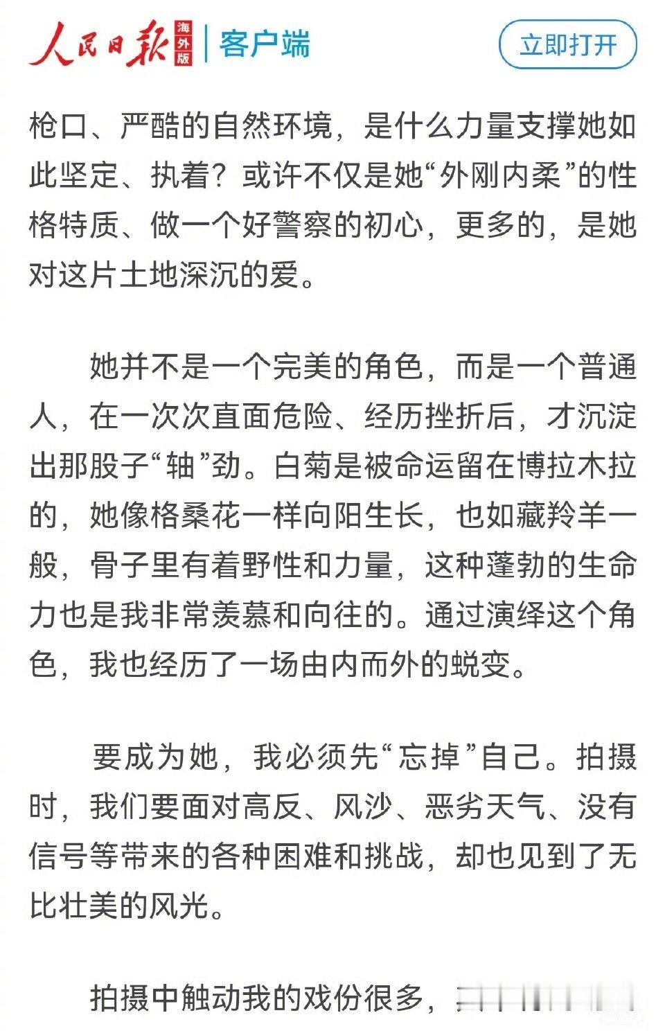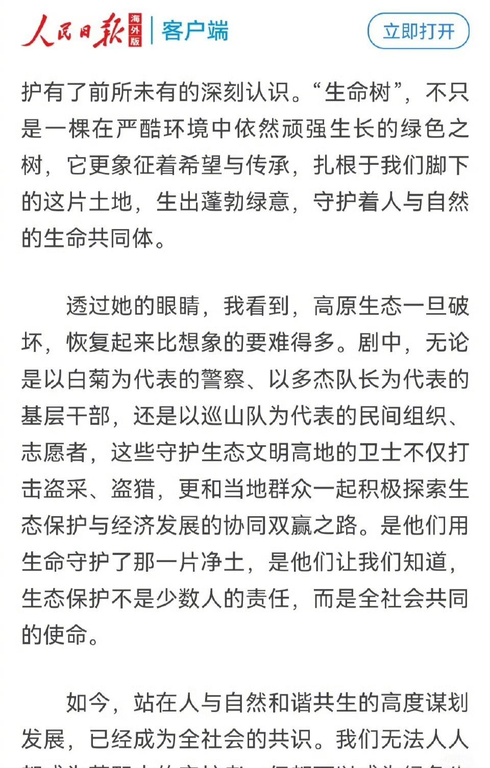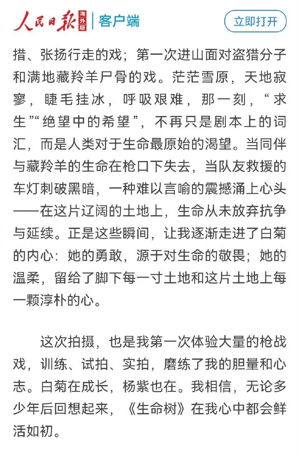 杨紫人民日报海外版撰文 真的为杨紫感到骄傲!看得出来《生命树》这部剧对杨紫来说具有里程碑式的意义,杨紫也有踏实认真用心的对待这部剧。她不只是用角色打动观众,更用文字传递温度和力量。用自己的影响力去传递正能量,关注自然、敬畏生命,这才是青年演员最动人的样子。一路稳扎稳打,用作品说话,用态度立身,越了解越让人喜欢,继续闪闪发光吧!