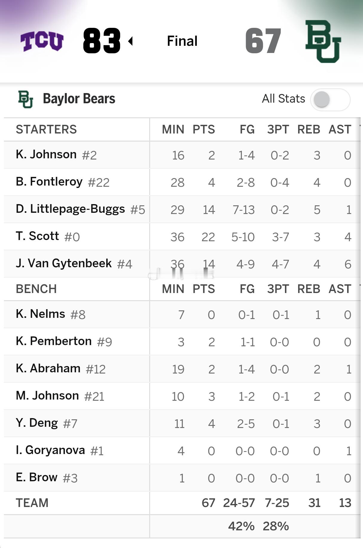在上午结束的一场NCAA女篮比赛,贝勒大学以67:83负于对手,邓雨婷上场11分钟,5投2中得到4分,最近这段时间,雨婷的状态不好,5场比赛里有3场比赛得分都挂0了,场均降到了7分,可能到了赛季中后期,身体有些疲惫,慢慢调整吧。留洋球员邓雨婷
