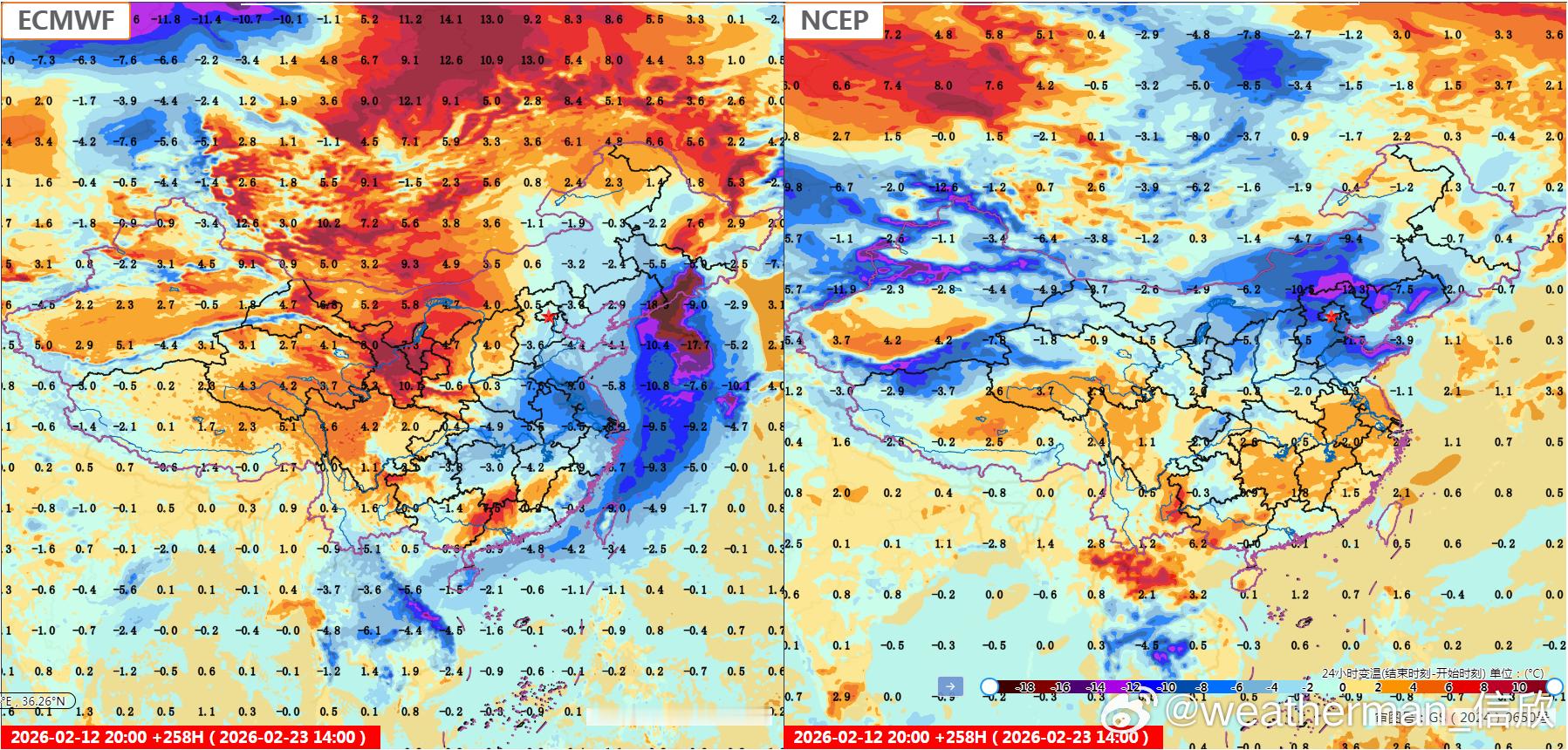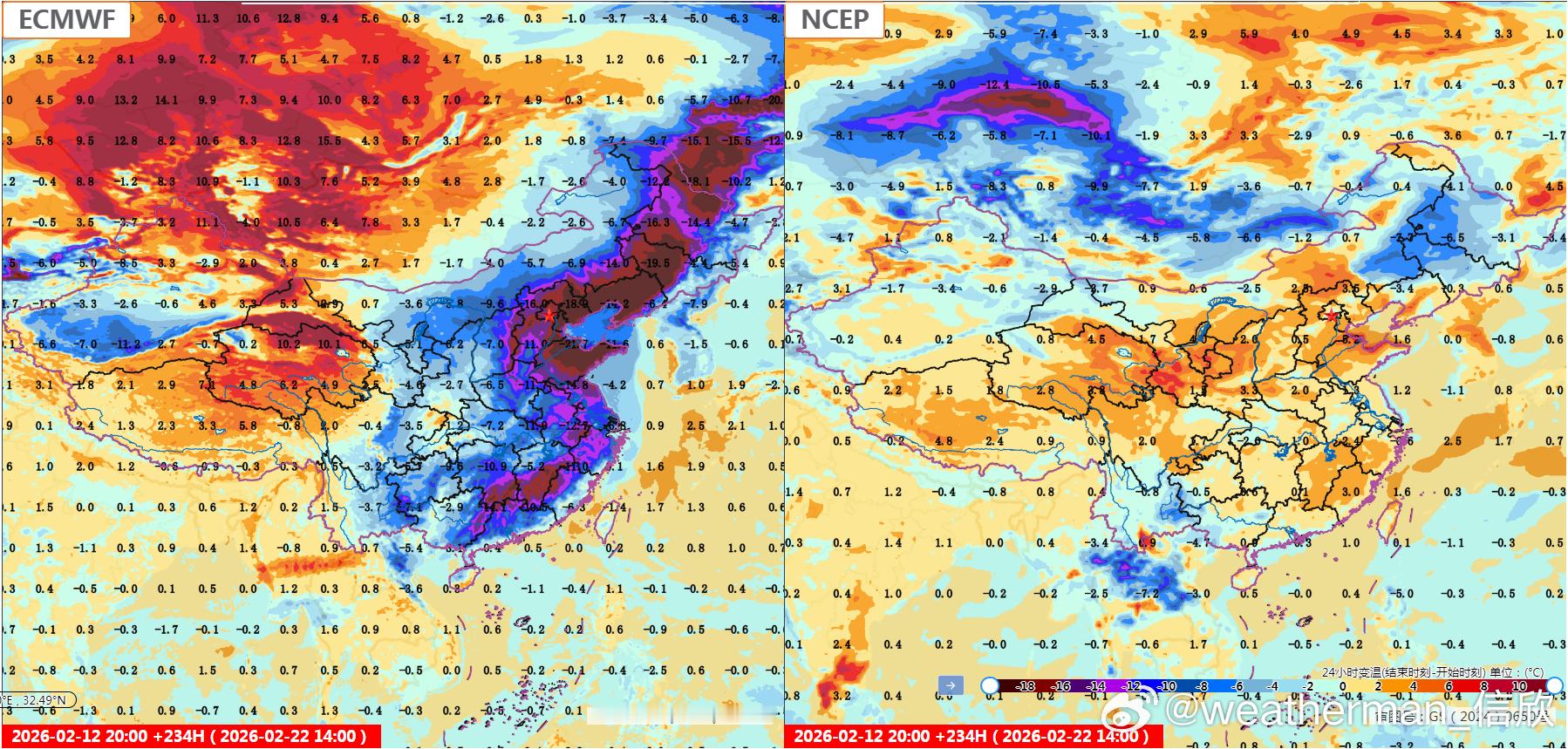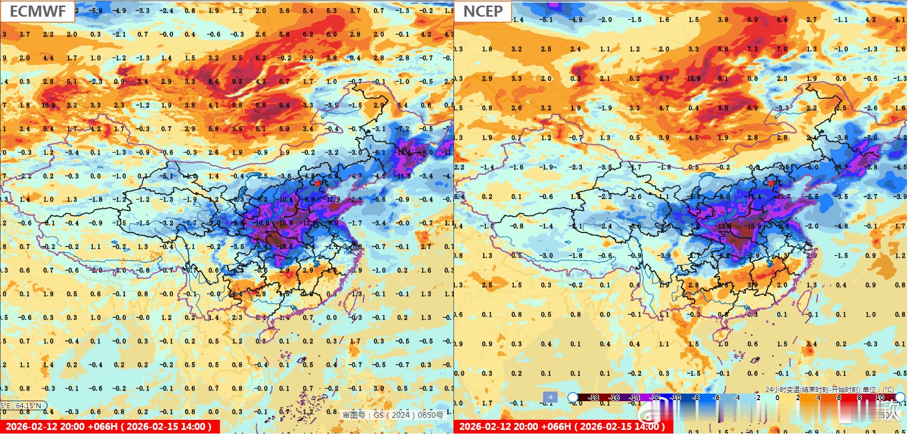 【春节假期气温展望】目前数值预报对假期开始的降温,分歧很小。15日强降温主要在长