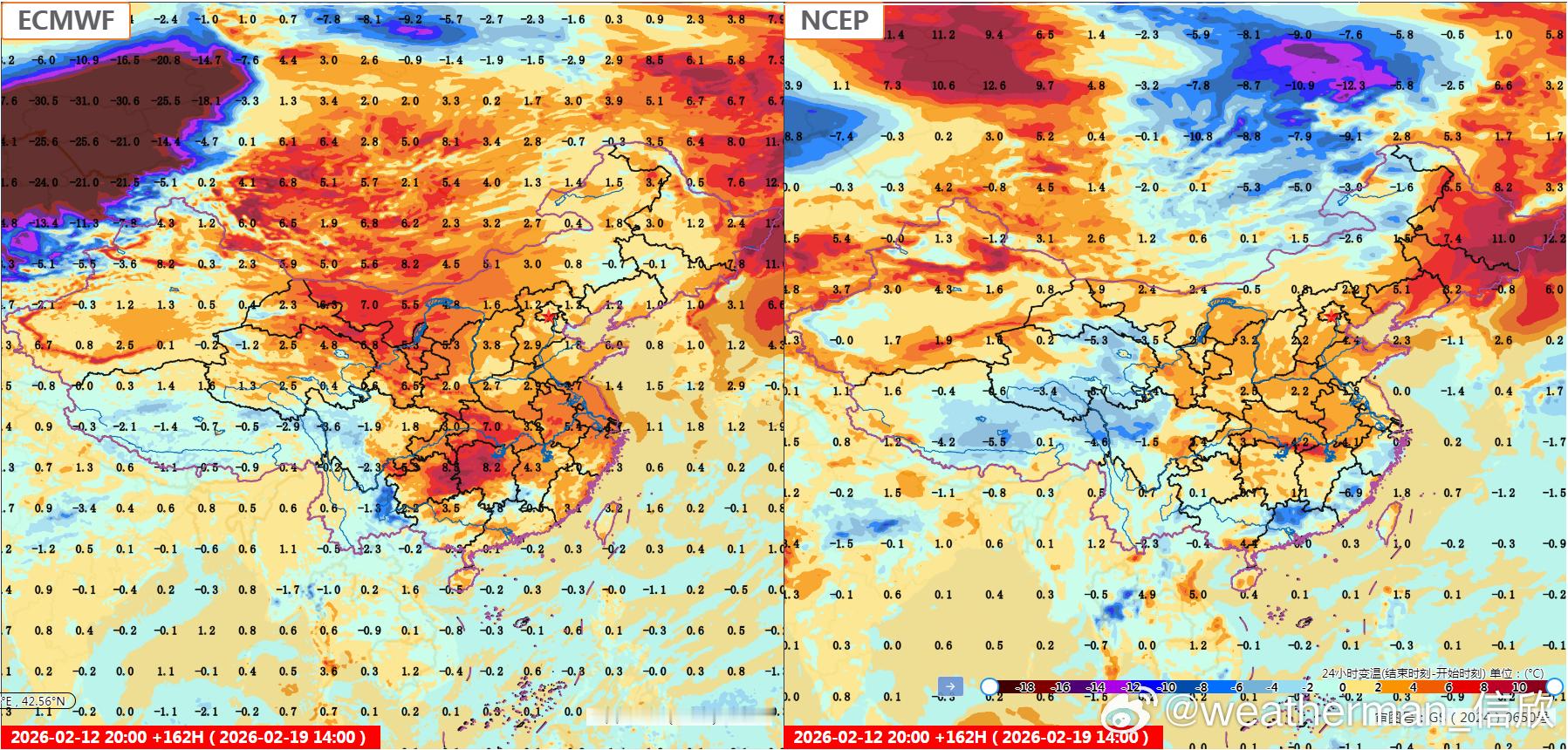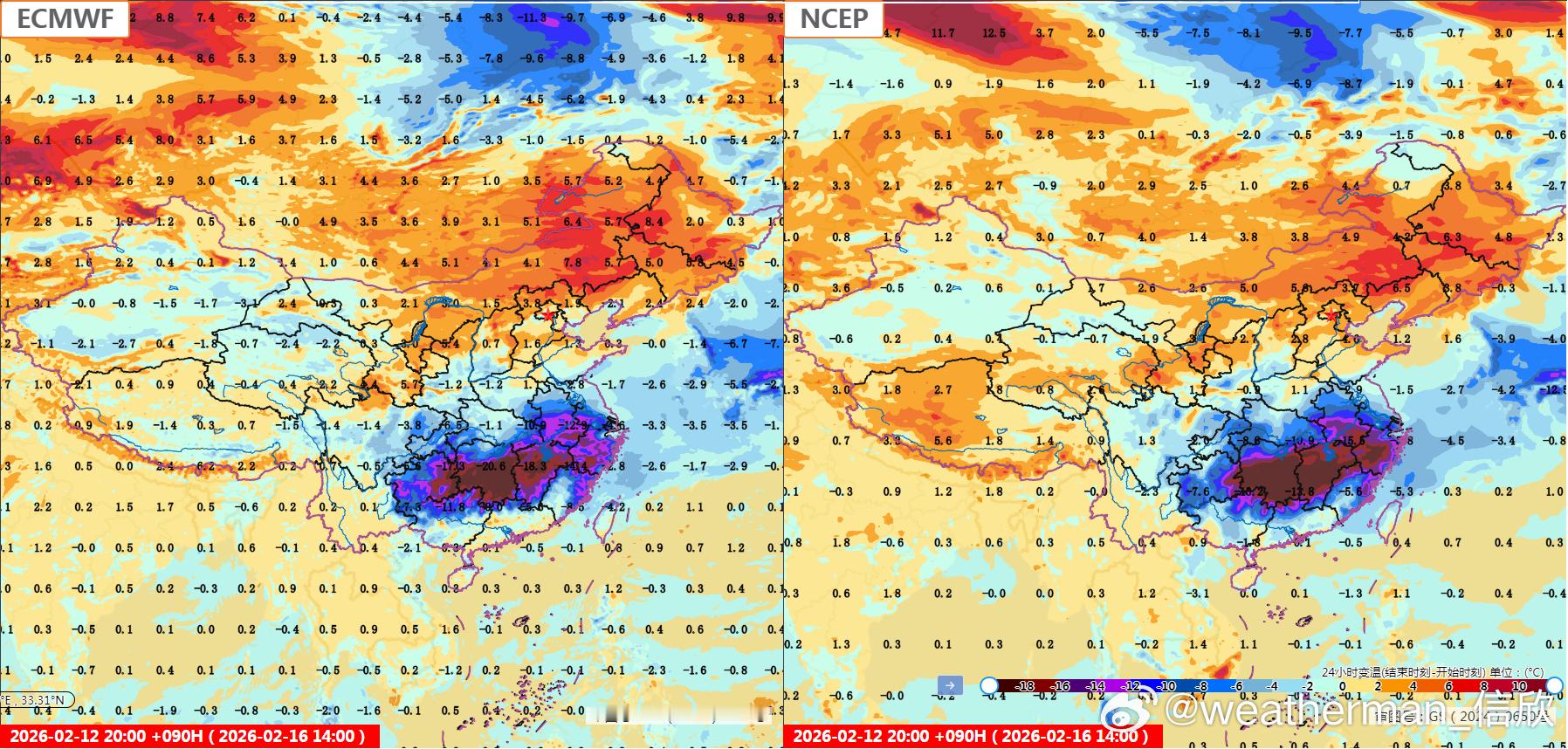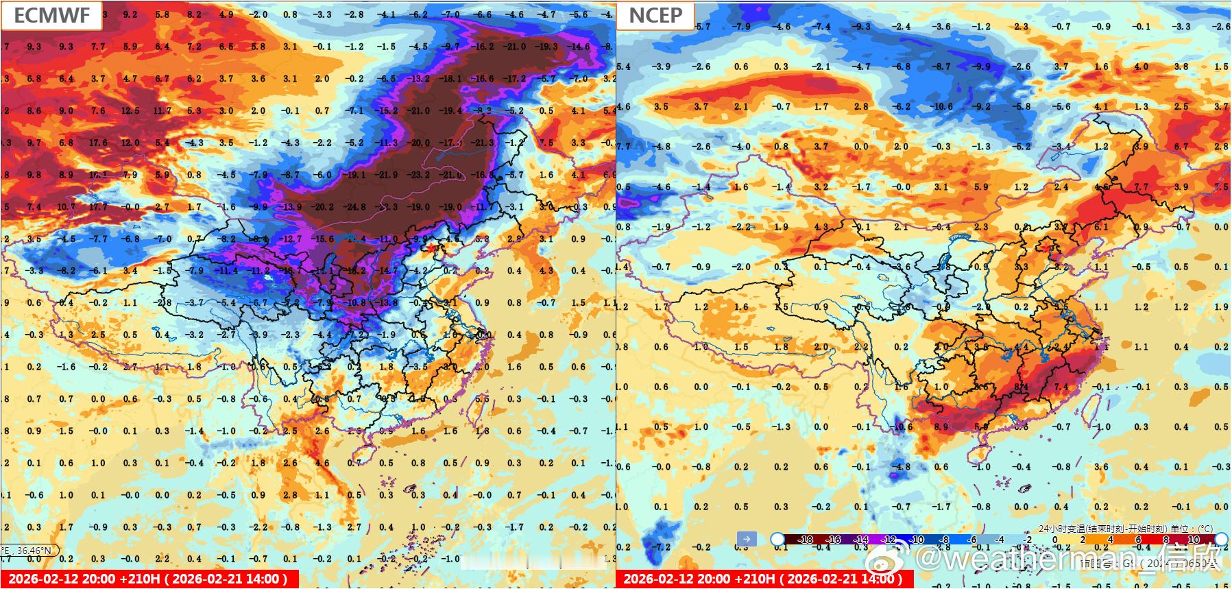 【春节假期气温展望】目前数值预报对假期开始的降温,分歧很小。15日强降温主要在长