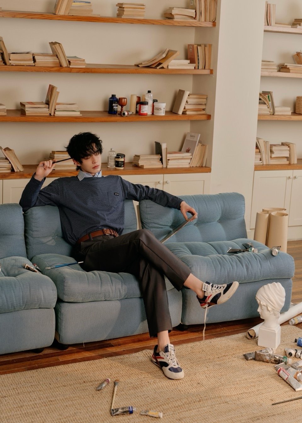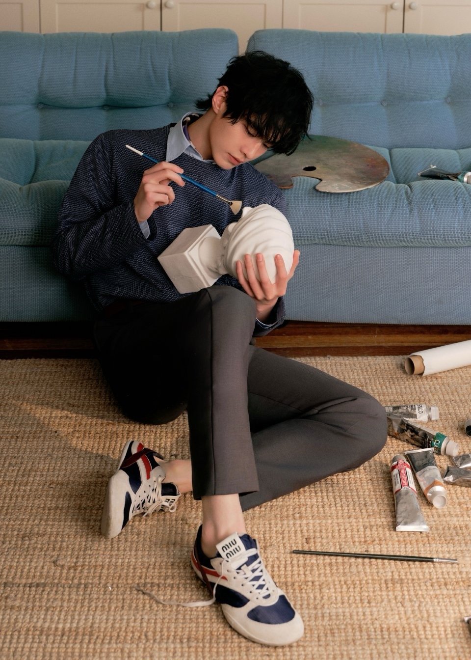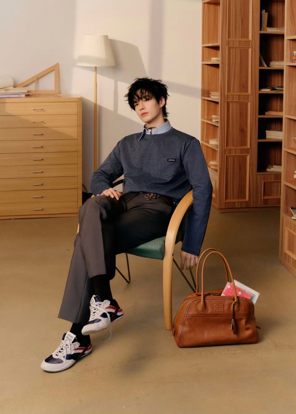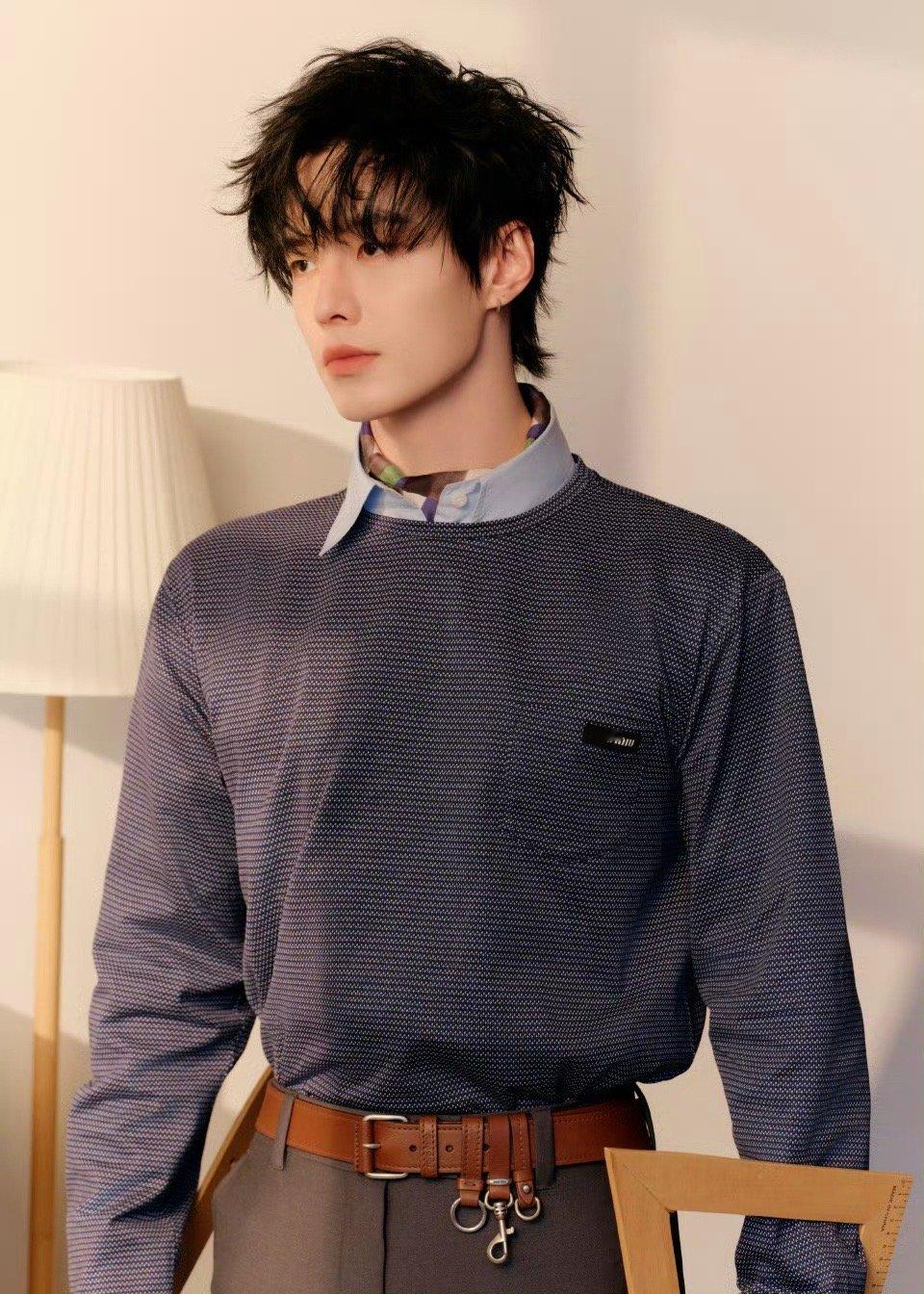 亮相Miu Miu快闪活动,身着MiuMiu Manifeste系列细格纹针织衫叠搭印花衬衫领,复古学院感拉满。 何与 何与miumiu活动生图路透