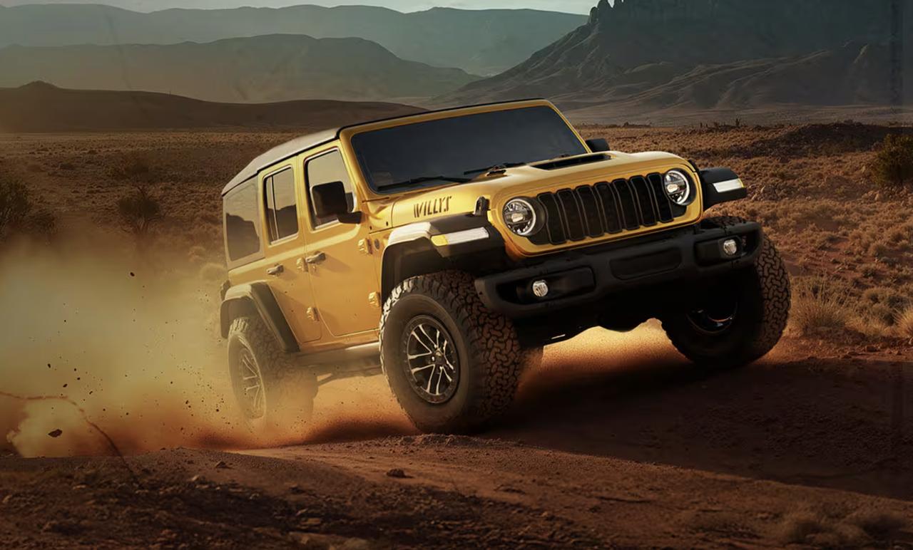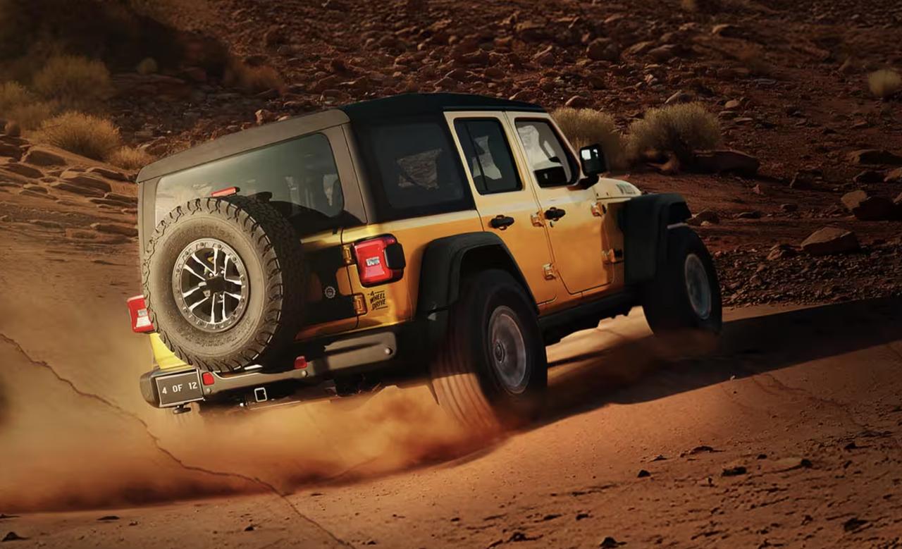 Jeep官方正式发布了牧马人Willys 392官图。新车定位低于Moab 392,将于今年3月在海外开售,起售价69,995美元。 核心动力方面,新车搭载经典的6.4升自然吸气HEMI V8发动机,爆发出477马力的最大功率和637牛·米的峰值扭矩。传动系统匹配全时四驱,并标配后桥电控限滑差速器以及4.56终传比。 外观上,Willys 392采用沙漠黄涂装,配备钢制前杠、经典的7孔格栅及专属机盖拉花。车侧宽体轮眉下,标配17英寸防脱圈轮毂与35英寸百路驰KO2越野轮胎,离地间隙高达282毫米。车尾牌照区的“4 of 12”标识。 车你配备带加热功能的专属Nappa真皮座椅、12.3英寸中控多媒体显示屏及Alpine 9扬声器音响系统,并预留4个自定义辅助开关,兼顾了硬派越野需求与日常舒适性。【来自懂车帝车友圈】