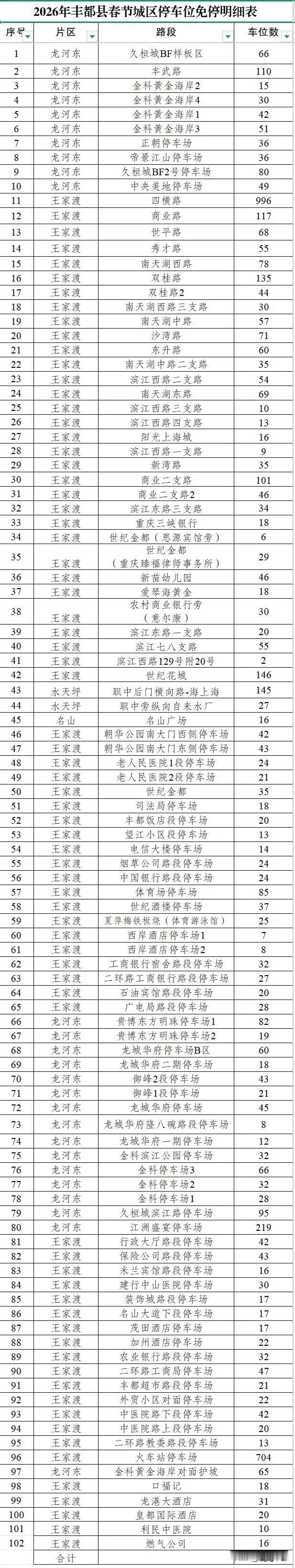丰都车主集合啦🔥 春节这些路段停车免费 丰都停车也太宠粉了😭 感谢大家一直以来对丰都停车的信任和支持,新春福利必须安排上~ 除夕到正月初二,不用花一分钱停车! 划重点✅ 102个路内停车点、整整5798个泊位,全部免费停! ⏰ 免费时间记牢啦:2026年2月16日0时 — 2026年2月18日24时(除夕到初二,整整3天!) 💡 温馨小提醒,大家一定要看仔细: 1. 节日期间停车人多,宝子们记得自觉守秩序,锁好车门、带好贵重物品,别大意哦; 2. 停车后建议留个联系方式,万一有突发情况,方便及时联系到你; 3. 重点!丰都停车人工客服24小时在线✨ 有任何停车问题、想咨询事宜,直接打023-70704230,全程无忧~ 最后祝丰都所有车主,马年大吉、出行顺利,春节嗨玩不用愁停车!赶紧转发给身边开车的朋友,一起享福利👇