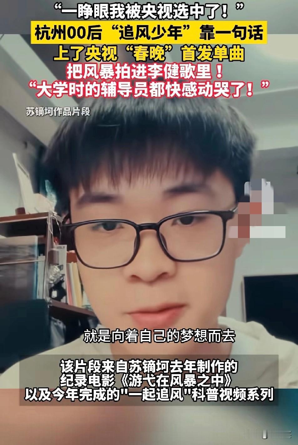 杭州00后气象摄影师 苏镝坷火了 他拍摄的风暴影像,被央视春晚选中 剪进了李健的首发单曲《人间共鸣》MV里 他说:“一睁眼我被央视选中了!” 大学辅导员看到后,都快感动哭了 2025年研究生毕业后,他在杭州望江创立工作室 用镜头追逐风暴 制作纪录电影《游弋在风暴之中》和“一起追风”科普系列 他说:“无论遇到什么困难,都可以去尝试,向着自己的梦想而去。” 愿我们都能勇敢追逐自己的热爱!