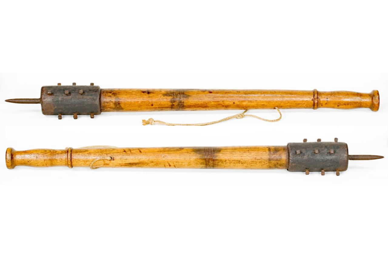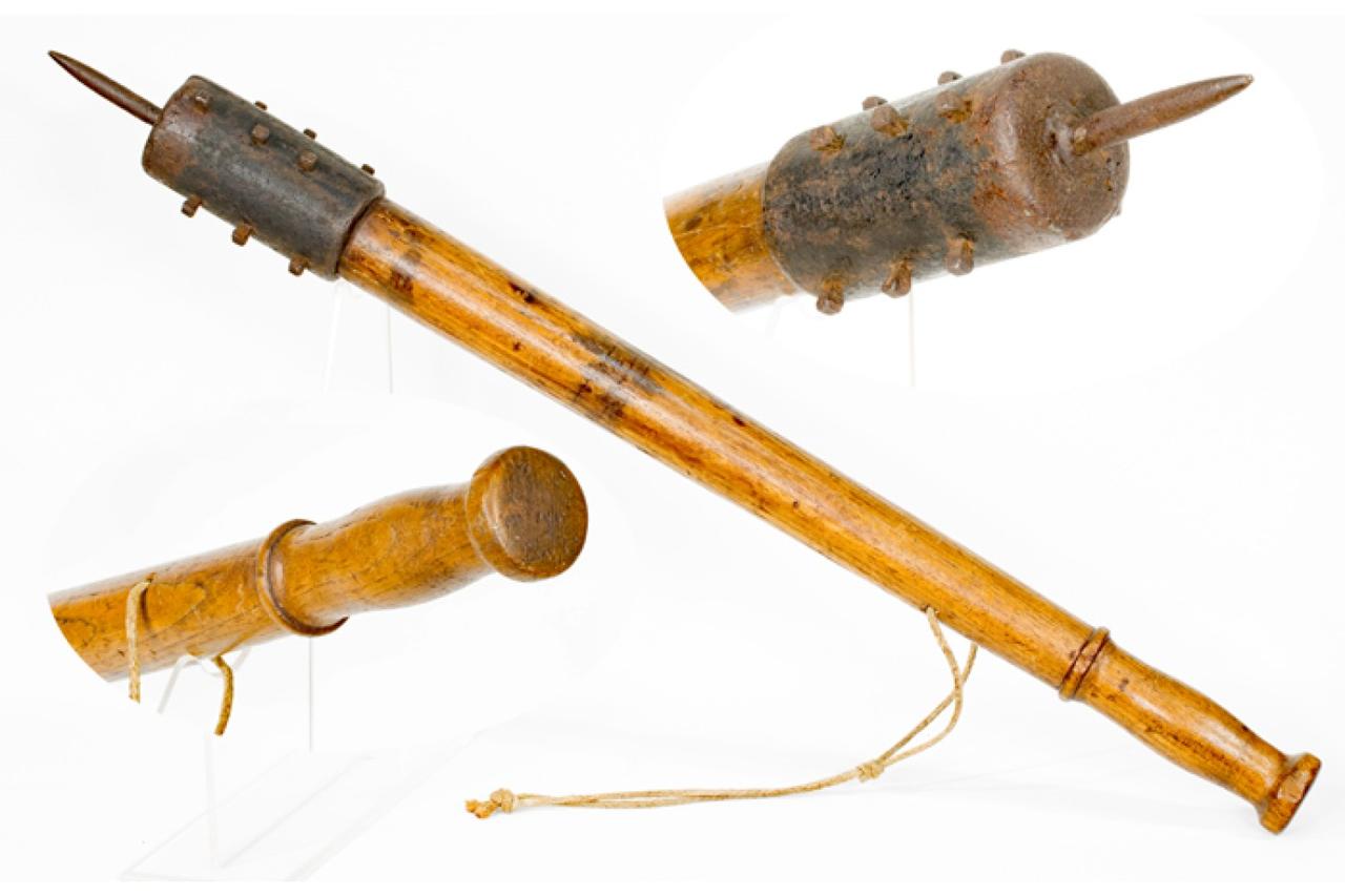 [呲牙] 咱们这个“打印器械”(参见图1)和当年第一次世界大战期间的“战壕棒”(参见图2~3)非常相似啊——棒身都有凸起,棒首还有尖刺,可砸击、可刺击。不过,咱们的这个“打印器械”是长柄的,抡起来势大力沉,杀伤力更大。而且,其杀伤部分是用两枚螺丝固定在柄上,可以随时更换(比如可以换成“青龙偃月刀”的刀头~)。