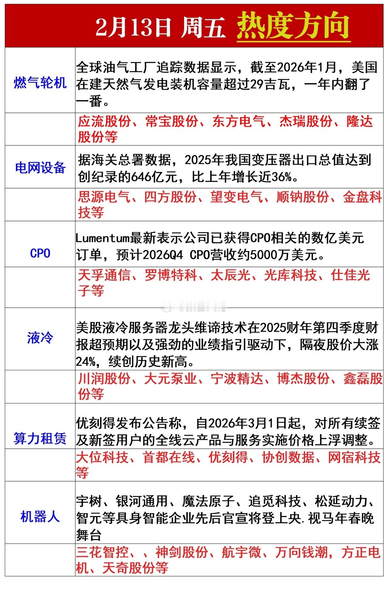 2.13周五市场热点方向+投资逻辑!1.燃气轮机2.电网设备3.CP