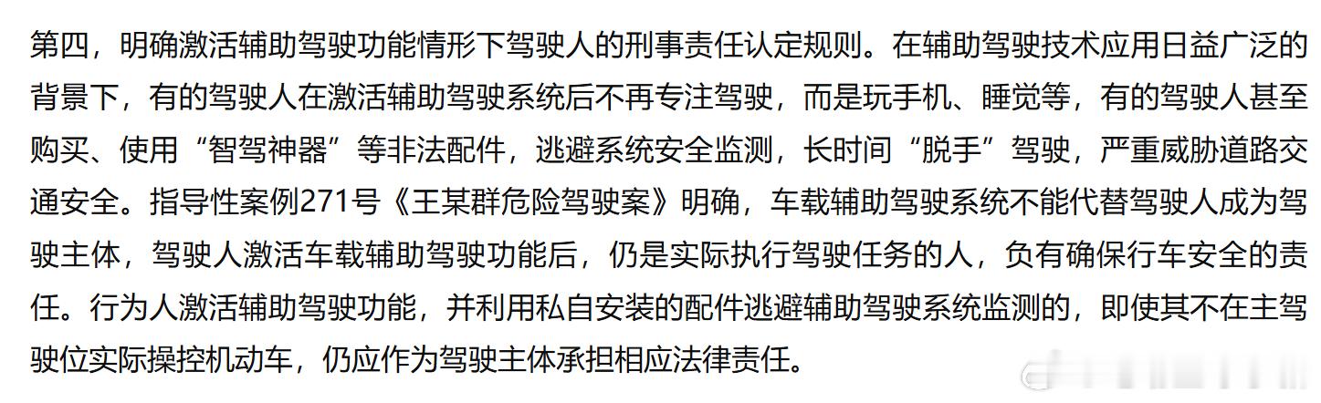 该案例明确,车载辅助驾驶系统不能代替驾驶人成为驾驶主体,驾驶人激活车载辅助驾驶功能后,仍是实际执行驾驶任务的人,负有确保行车安全的责任。即使驾驶人不在驾驶位也一样。