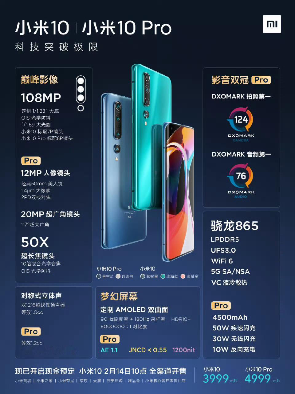 小米10、小米10 Pro 发布!为你打造的「梦幻之作」DXOMARK影音双冠:相机第一,音频第一(Pro)梦幻性能:骁龙865 + LPDDR5 + UFS 3.0 + WiFi6梦幻影音:1亿像素8K电影相机,对称式立体声梦幻屏幕:高端定制AMOLED曲面屏,专业级色准