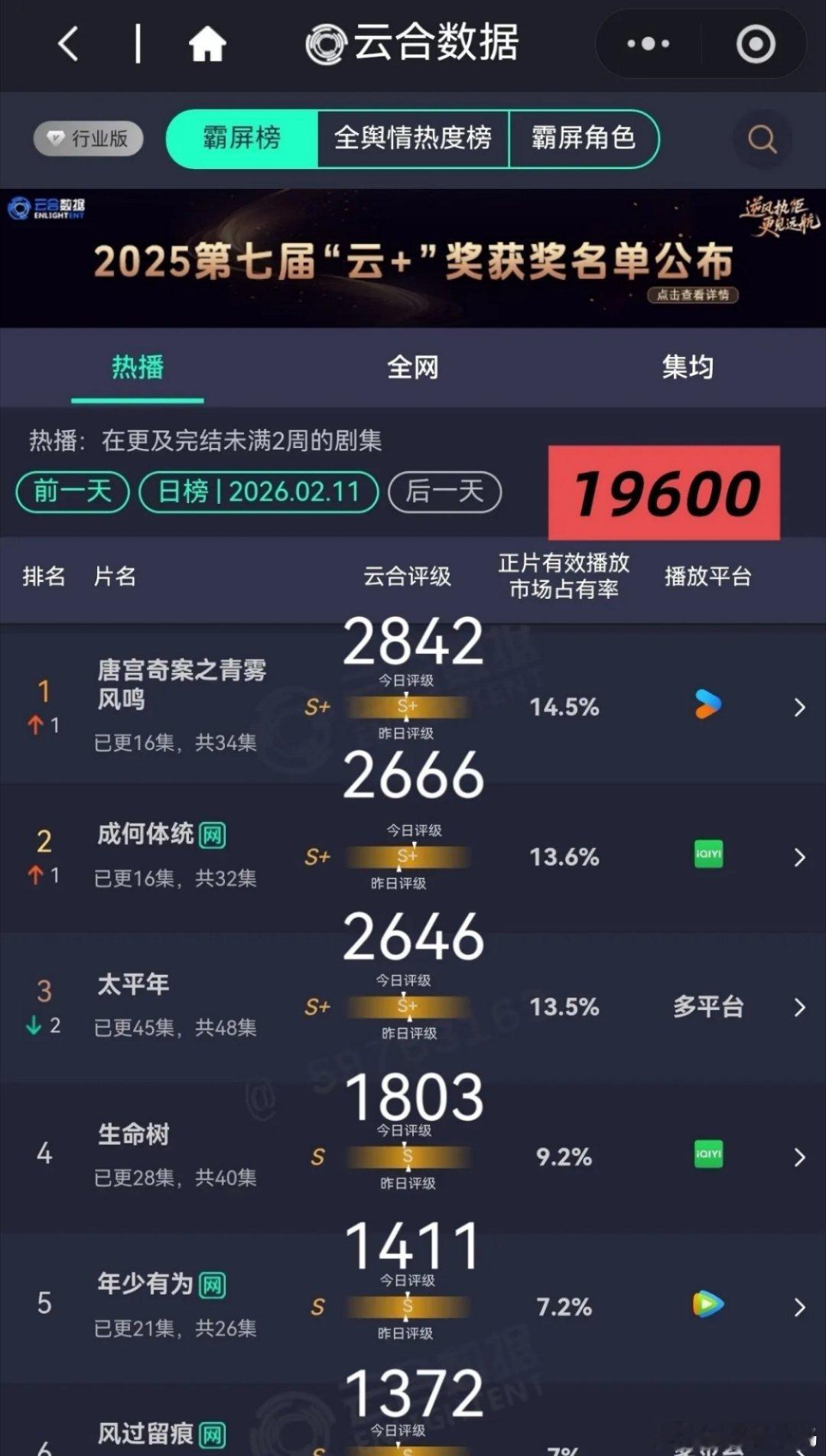 《唐宫奇案》居然成功登顶了!我本来以为这部剧得等《太平年》彻底完结了,才能拿到云合榜第一呢,看来还是小看白鹿的扛剧本事了。这是《唐宫奇案》头一回冲上云合日榜第一,《成何体统》紧跟着排第二,《太平年》眼看就要结束了,排名掉了两位,到第三去了,还挺可惜的。接下来就看《唐宫奇案》和《成何体统》的终极比拼了,目前来看《唐宫奇案》赢面更大,毕竟白鹿和王星越都各自有爆剧在身,号召力还是挺强的嘛!