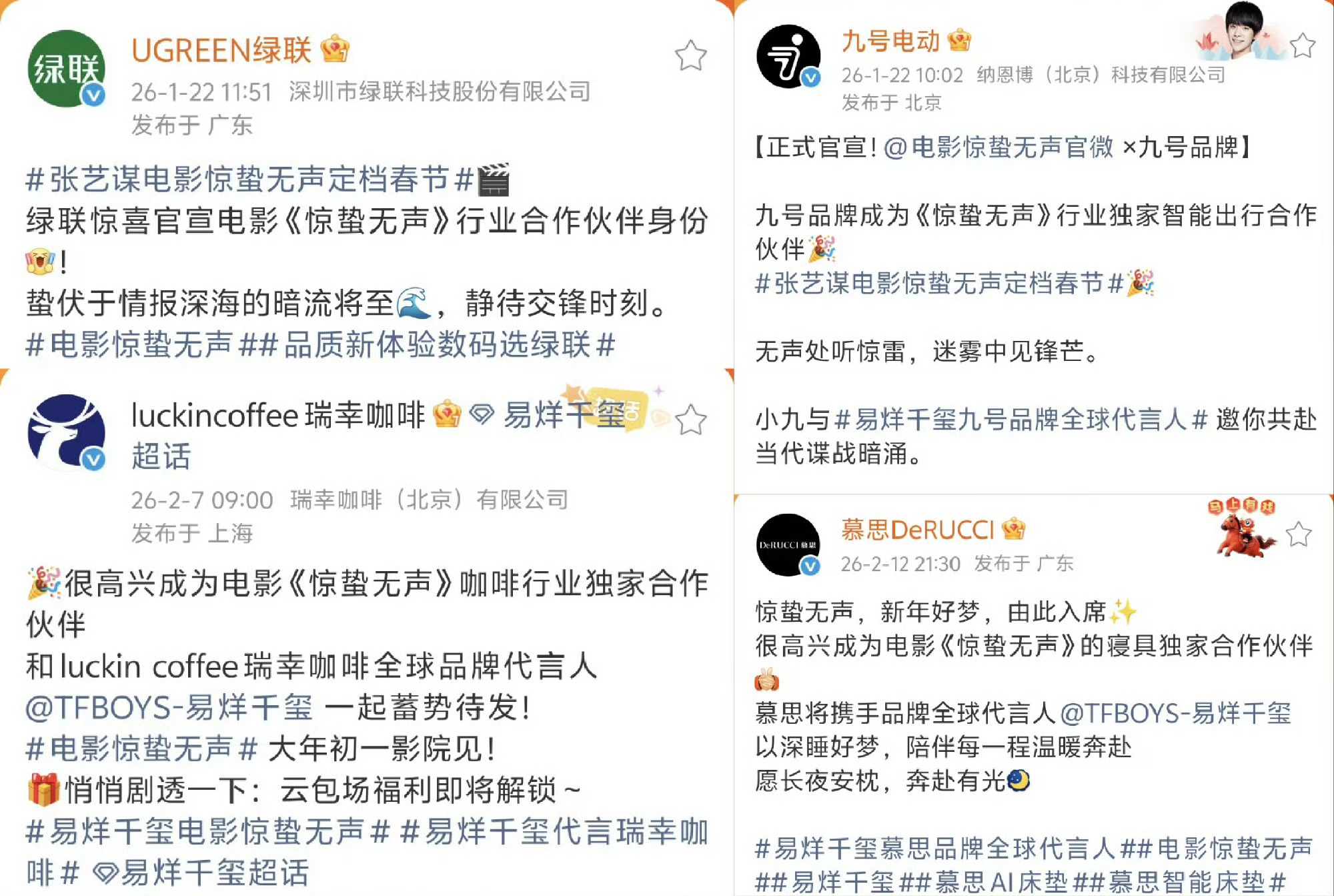 易烊千玺品牌方包场惊蛰无声 易烊千玺品牌方包场《惊蛰无声》多个代言品牌不仅官宣与惊蛰无声合作,还豪气包场搞联动,期待《惊蛰无声》一番男主易烊千玺