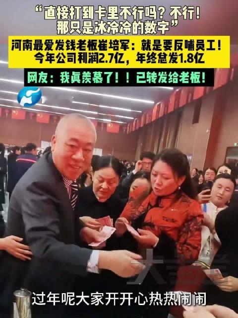 盈利2.7亿,1.8亿发给员工!河南这位老板一句话让人破防:“我不是爱发钱,是见不得年轻人背着车贷房贷还不敢请假” 如果你觉得今年的年终奖“还可以”,建议你看看河南长垣。 2月12日,全网最爱发钱的老板崔培军又出手了。 公司去年利润2.7亿,他拿出1.8亿发年终奖。 不是股票,不是期权,不是“五年后兑现”。 是真金白银,堆成小山,让员工上台自己数,数多少拿多少。 有人问:为什么不直接打卡里?多省事。 崔培军说了一句话,让无数打工人破防:“打到卡里是冷冰冰的数字,年会发钱,我想和他们见个面,握个手。” 这场年会,不是发钱,是“过年” 如果你以为这只是发钱,那就看小了。 2月13日,腊月二十六。7000名员工带着家属,从四面八方赶来赴宴。 厂区三个车间改成了宴会厅,700多桌宴席一字排开。6家专业厨师团队,几百号帮厨忙了整整两天。 菜单里有螃蟹,有鲜蔬,有热腾腾的年味。 舞台上是屠洪刚,《霸王别姬》一开嗓,台下碰杯声、笑声、孩子的喊叫声混成一片。 这不是公司年会。 这是河南矿山这户“大家庭”的年夜饭。 崔培军是那个坐在主桌、见谁都招呼“多吃点”的大家长。 “数钱数到手抽筋”,今年的规矩更狠了 河南矿山的年会,有两个保留节目。 一是发钱。去年1.7亿,今年1.8亿。现场光现金就堆了6000万。 二是数钱。员工上台,给你一摞现金,15分钟内数多少拿多少。 今年规则改了:数钱时间从10分钟延长到15分钟。 别小看这5分钟。现场工作人员说,去年有人数到手抽筋还舍不得停,下来时手心全是汗。 那不是贪,那是辛苦一年终于被看见的踏实。 更暖的是:获奖员工和劳模可以带配偶来,红包直接拿双份。 他好像什么都想到了。 这个老板,把“人情味”做成了企业制度 有人说他作秀。但什么秀能一做就是22年? 建厂第二年,他就开始资助贫困学生。22年,4800多个孩子。 有个受助的女孩后来当了空姐,在飞机上认出崔培军,蹲下来说:“崔总,我是您资助过的学生。” 他摆摆手:“不要你回报,飞得更高就行。” 每年麦收,员工带薪回家收麦,每人发1000元收割机补贴。 妇女节,近2000名女员工,每人 800元现金加玫瑰——已婚的送妻子,未婚的交父母。 更绝的是那个办了13年的“孝文化旅游节”。 去年3月,77辆大巴拉着4000多位员工父母去上海、杭州。 很多老人这辈子第一次坐飞机,第一次出省。有人站在黄浦江边偷偷抹眼泪:“我儿子在这厂里,我放心。” 你很难分清,这到底是企业文化,还是一个人对“将心比心”这四个字的朴素执行。 我们羡慕的不是钱,是被当人看 有网友算了一笔账:2.7亿利润,发掉1.8亿,留给公司发展的不到1个亿。 崔培军不傻。 他说:“员工是企业的基础,一个家长连自己孩子都不爱护,企业能做好吗?” 这句话,应该让很多老板抄下来贴在办公桌上。 这几年,我们见过太多“优化”“毕业”“向社会输送人才”的精致话术。 河南矿山的工人们不懂那些词汇。他们只知道:今年干得不错,老板发了钱;明年再加把劲,还能带老婆来吃饭。 这就是最朴素的劳资关系—— 你把员工当人,员工把厂当家 有人说:又是别人家的老板。 也有人说:这种老板活该他赚钱。 但有一条点赞最高的话是这么写的: “我不是羡慕那1.8亿,我是羡慕那个‘能减轻一点是一点’的心。” 2.7亿,拿出三分之二。 这已经不是格局,是慈悲。 你今年的年终奖发了多少?如果让你上台“数钱”,你觉得自己15分钟能数多少?评论区见👇