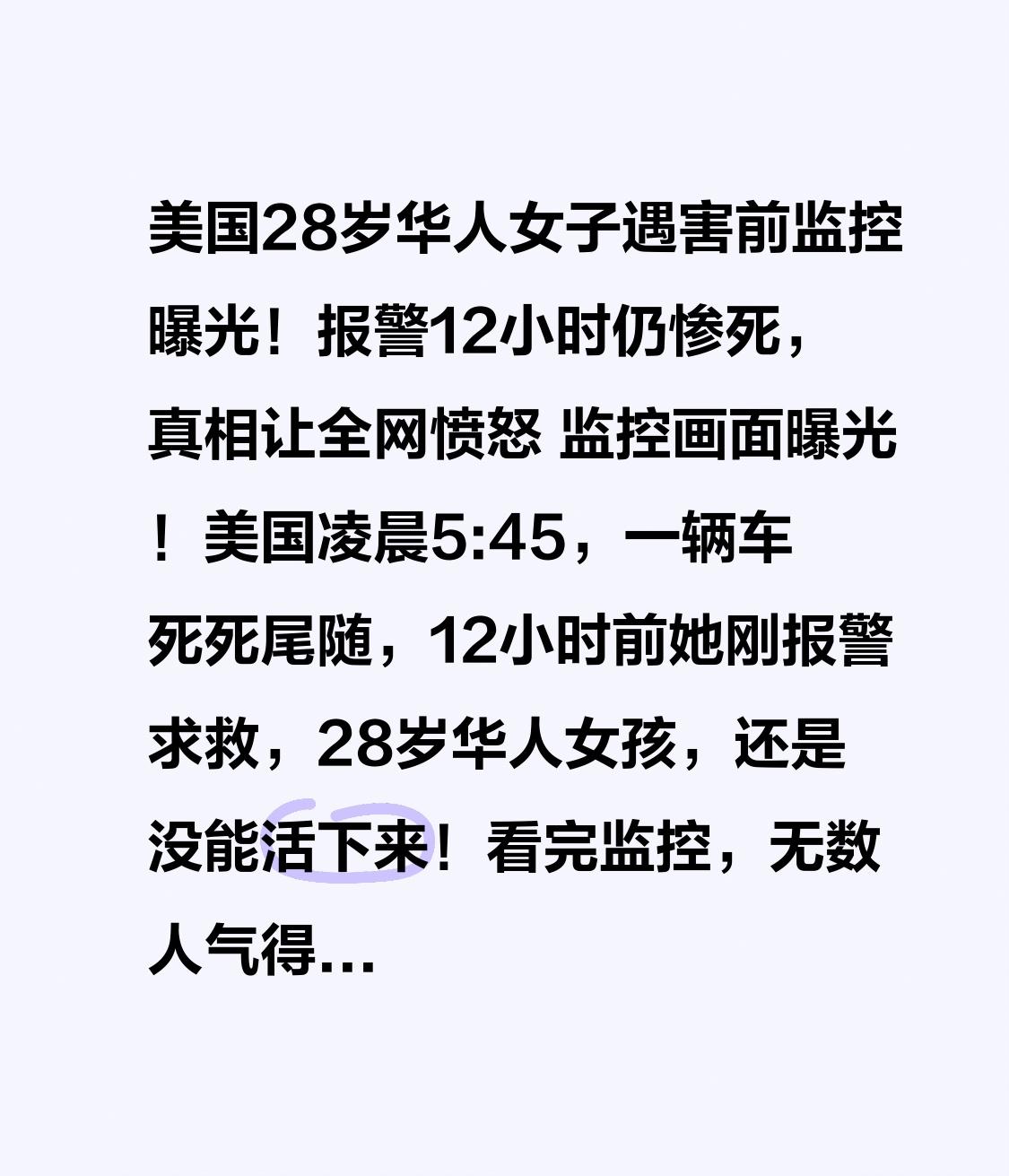 美国28岁华人女子遇害前监控曝光!报警12小时仍惨死,真相让全网愤怒 监控画面曝光!美国凌晨5:45,一辆车死死尾随,12小时前她刚报警求救,28岁华人女孩,还是没能活下来!看完监控,无数人气得发抖! 美国宾夕法尼亚州,28岁华人女子卢媛媛,原本有着光明的人生。移民美国十几年,努力打拼、性格温和,谁也没料到,噩梦藏在一段感情里。 交往一年,男友任宇俊性格极端、控制欲极强,长期骚扰、威胁,甚至非法持枪。2月7日晚,卢媛媛鼓起勇气,向费城警方正式报案:被性侵、被跟踪、被蹲守公寓,她拉黑对方、收拾行李,只想彻底逃离。 她提交了监控截图、证据齐全,哭着求保护。所有人都以为,报警就能保命,她也以为,天亮就安全了。 谁能想到,这竟是她生命最后12小时。 2月8日凌晨5:45,路边监控清晰拍下:卢媛媛驾车出门,身后一辆银色轿车紧紧尾随,一步不离。长达7小时的跟踪,像一张死亡大网,慢慢收紧。 她以为已经摆脱,她以为警方会保护她,她以为天亮就能重获自由。 几小时后,枪声响起。 卢媛媛倒在自己车里,头部中枪,当场身亡。28岁的人生,永远停在了异国他乡的街头。 凶手随后在律师陪同下自首,轻描淡写说“枪支走火”“只是想吓唬她”。一条鲜活的生命,在他嘴里,如此廉价。 更让人心寒的是:提前报警、证据充足、明确被威胁,却依然没能阻止悲剧。监控里那辆尾随的车,像一根刺,扎在所有人心上。 一个女孩要多勇敢,才能鼓起勇气分手、报警、求助? 一个女孩要多绝望,才会在求救之后,依然没能躲过伤害? 这不是个例,是无数身处危险关系中的女性缩影。 异国他乡,无依无靠,遇人不淑,求助无门,监控拍下的不仅是尾随,更是绝望。 愿天堂没有伤害,愿凶手得到最重的惩罚,愿所有女孩都能被温柔守护,远离极端前任、远离暴力、远离危险。 出门在外,安全永远第一!遇到偏执、暴力、跟踪,第一时间远离、求助、保留证据! 看到这里,你愤怒吗?你想对凶手说什么?评论区留下你的看法,为女孩发声,转发提醒更多人!愿悲剧不再重演!