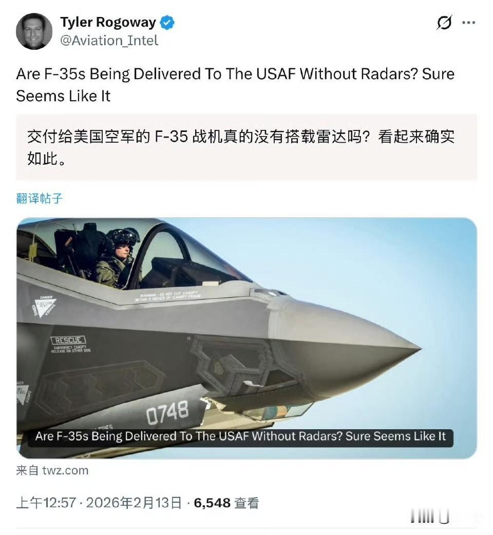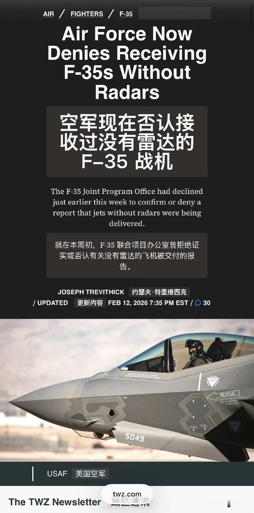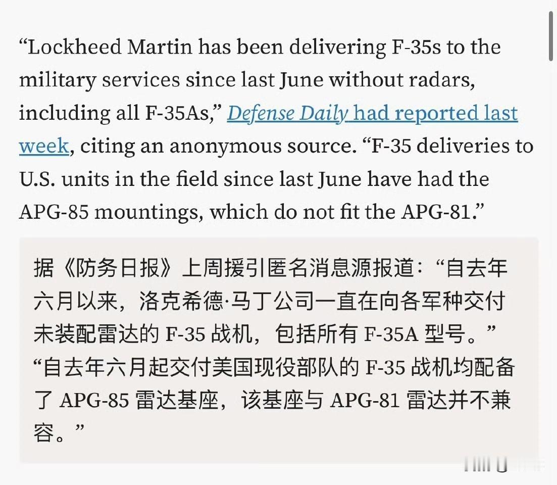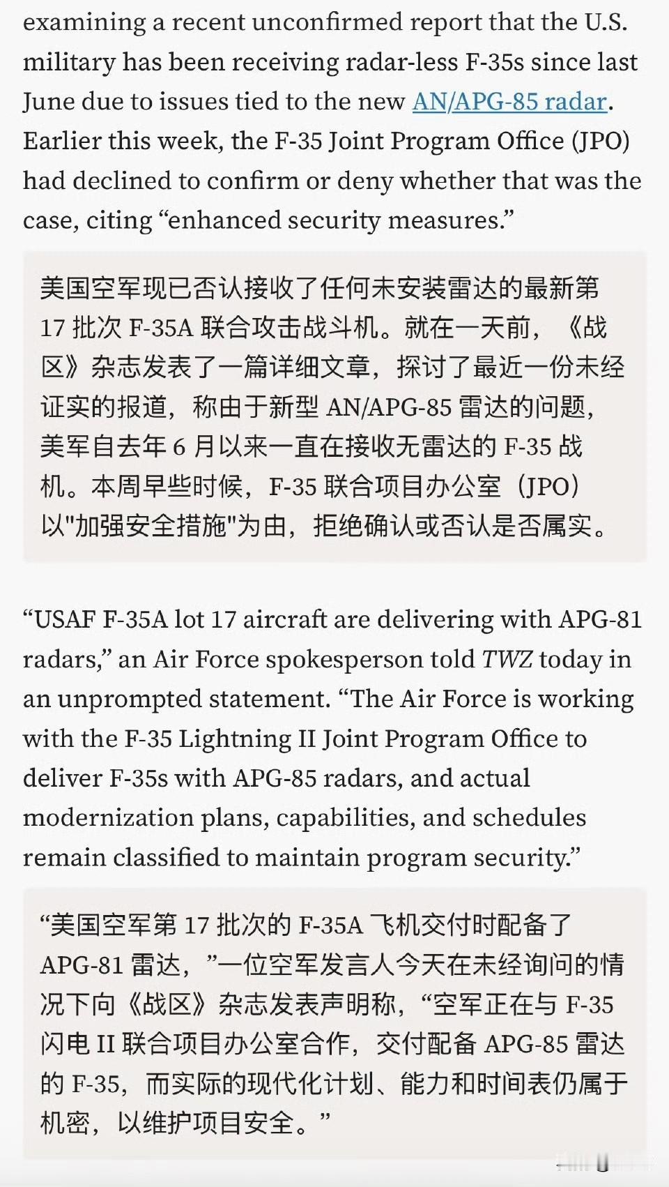 这位是TWZ的主编。现在美军不承认接收了没有雷达的F-35,辩称第17批次的F-35“安装了旧型号的APG-81雷达”。APG-85的底座怎么安装APG-81? 连美国媒体和网民自己都不信[吐舌]