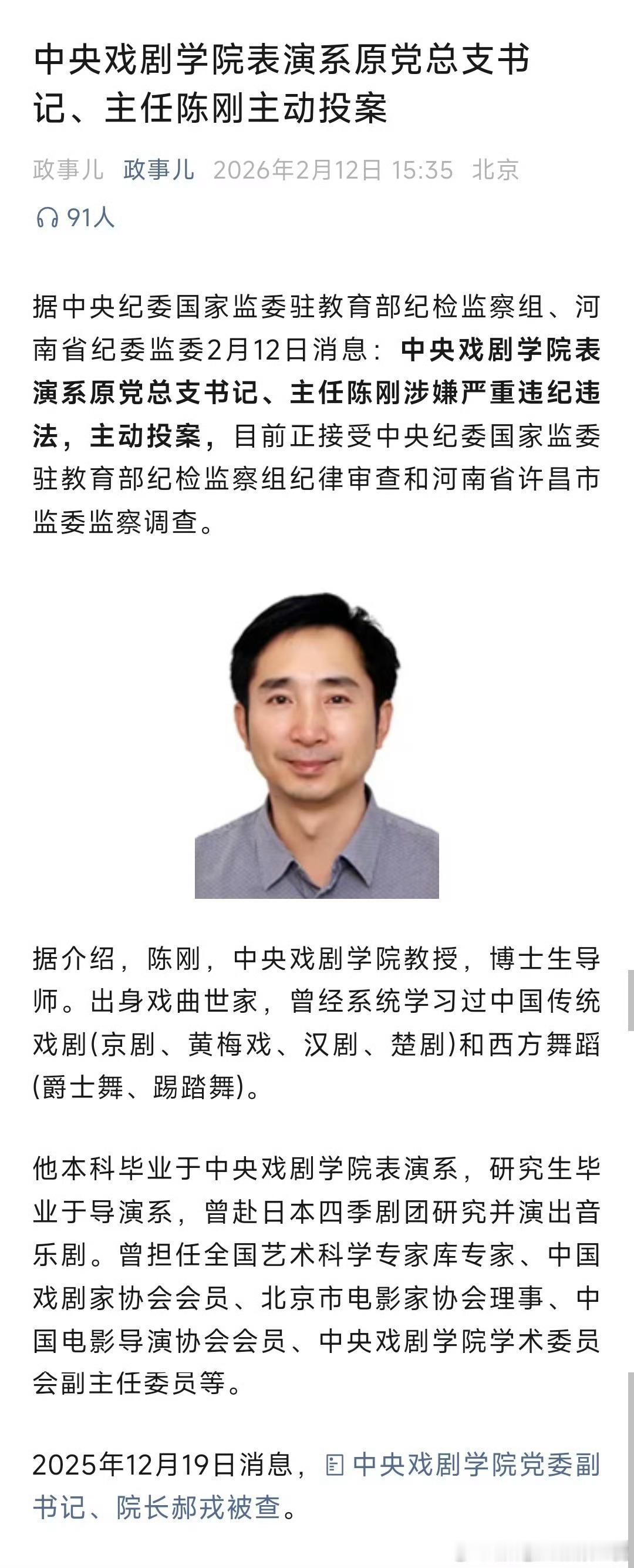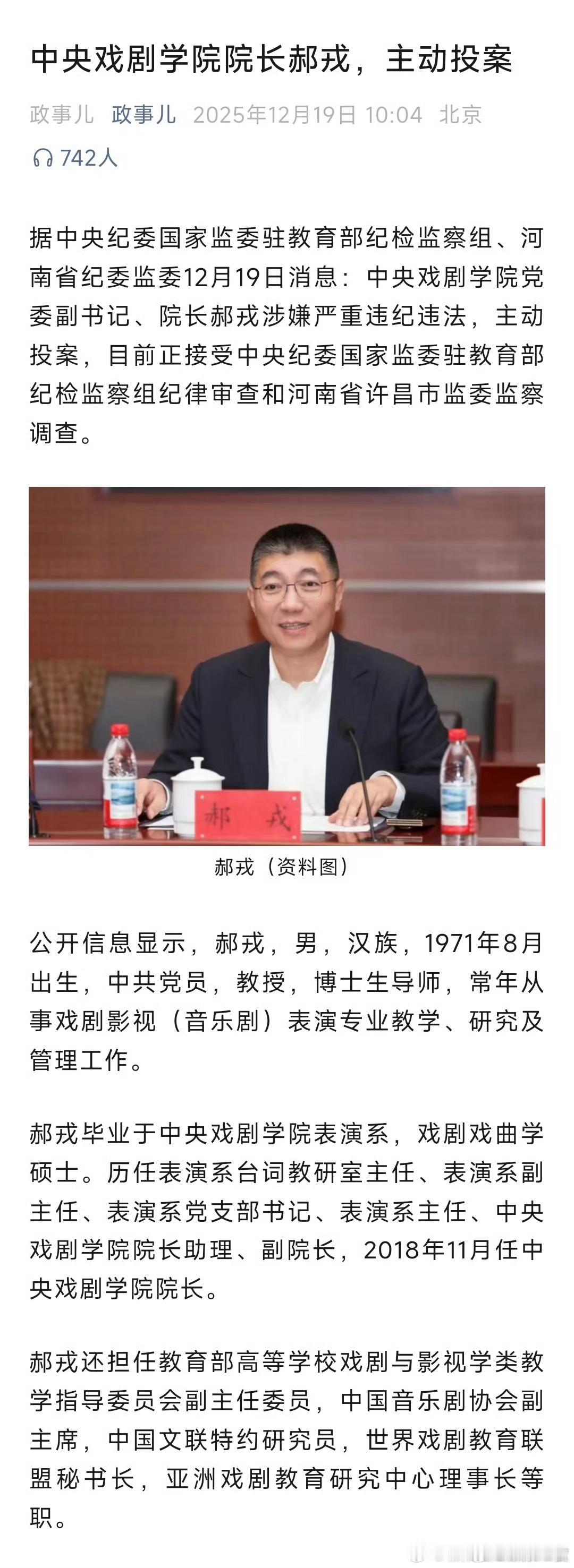 王鑫被查中戏这是怎么了?先是院长,昨天表演系原主任,今天表演系现主任?还以为是一个人呢,结果不是,俩人?中戏已有两位表演系主任主动投案网友这标题真会起啊这算娱乐圈新闻吗?
