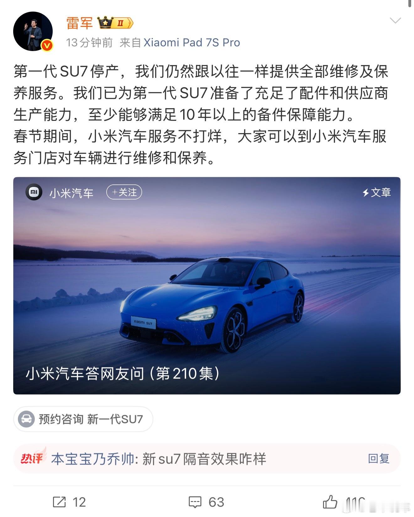 这个估计又会被喷,为什么第一代小米SU7的配件供应只满足10年以上,而不是15年甚至更长的时间周期!小米汽车小米su7