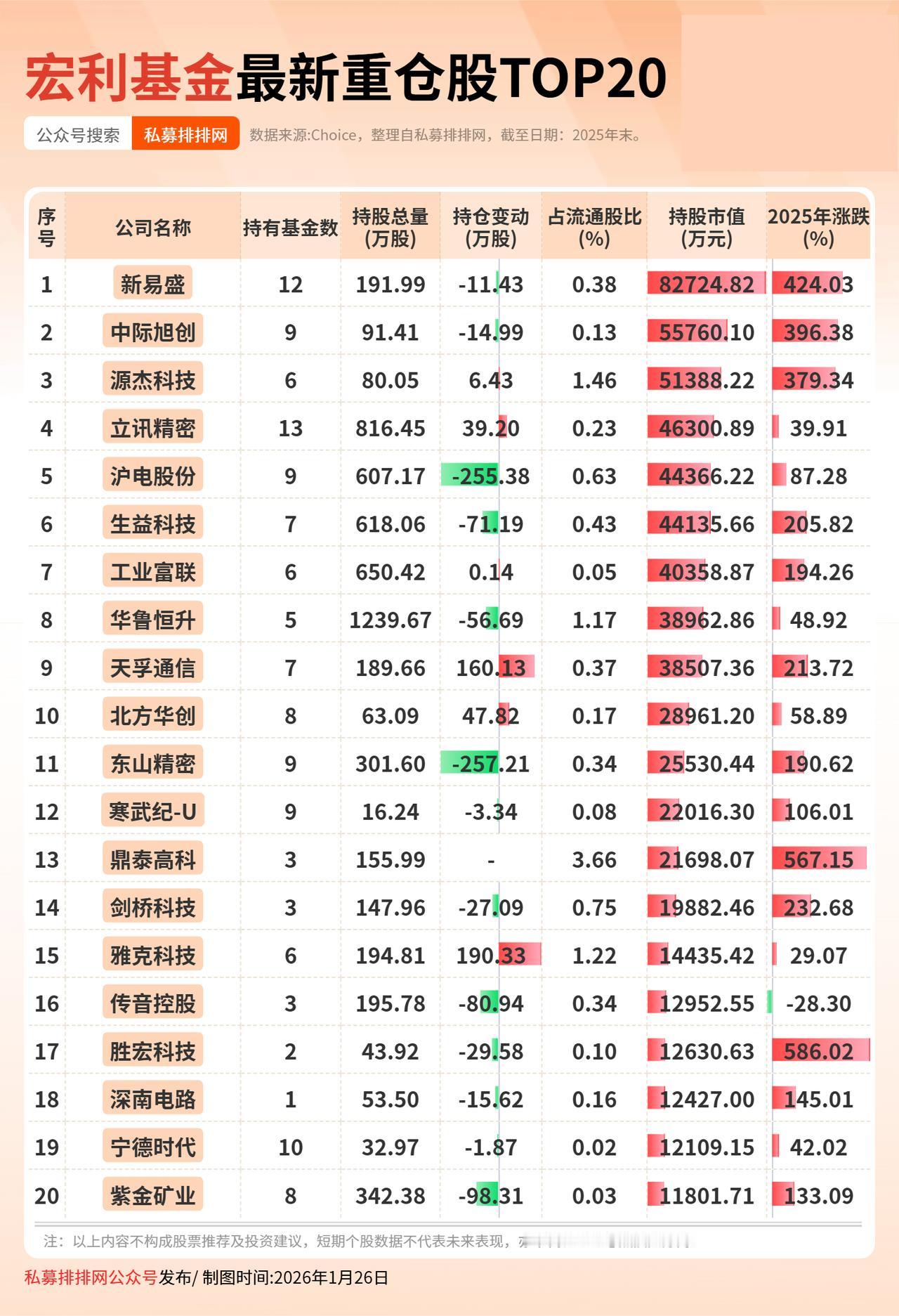 宏利基金最新持仓明细公布!持仓“易中天” (向右滑动图片查看完整名单) 宏利基金管理有限公司成立于2002年6月,是中国首批合资基金管理公司之一,注册资本1.8亿元人民币,由加拿大宏利金融集团旗下子公司宏利投资100%控股。 宏利基金持股明细一览表 宏利基金在2025年四季度末延续了对算力产业链的侧重布局,重点配置了CPO(光模块)、PCB(印制电路板)等环节。 宏利基金最新观点指出,AI作为全球重要的产业趋势,呈现出中美两国在产业上共振、在竞争中合作的格局,其产业链延伸所带来的投资机会具备中长期特征。从产业竞争力角度观察,在海外AI产业链的制造环节,中国相关企业已形成显著的产能优势与技术积累。 私募排排网大佬持仓数据显示,截至四季度末,宏利基金管理资产规模为1038.46亿元,较三季度末的1066.10亿元略有回落。2025年年报显示,该基金期末共持有215只股票,持仓总市值约187.61亿元。 其四季度末前二十大重仓股仍集中在算力产业链相关领域。从表现来看,这20只股票中仅1只年内小幅下跌,其余19只均实现显著上涨,其中涨幅超过100%的个股达12只。