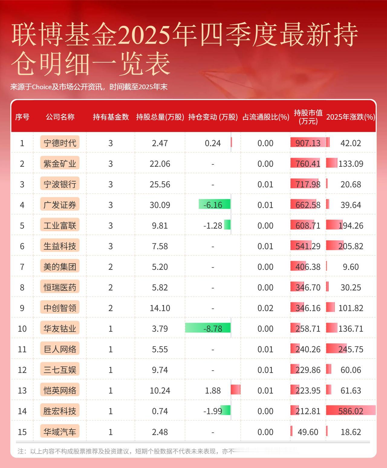 联博基金最新持仓明细一览(2025年四季度) (向右滑动图片查看完整名单) 联博基金(AllianceBernstein,简称AB)是一家起源于1967年美国的全球投资管理公司,1988年在纽交所上市。专注于股票、固定收益、多元资产主动管理,管理资产规模超8600亿美元。 2025年四季度联博基金持股明细一览表 联博基金2025年四季度的持仓呈现出“多元分散、均衡配置”的鲜明特征,覆盖新能源、矿业、金融、高端制造、消费、医药、游戏等多个赛道。 从行业分布来看,核心布局围绕两条主线展开:新能源领域或受益于全球电动化浪潮的持续推进;矿业板块或依托大宗商品价格上涨周期贡献弹性;高端制造领域或紧扣国产替代与制造业升级的产业趋势;同时,基金还配置了多家游戏标的,进一步丰富了持仓结构。