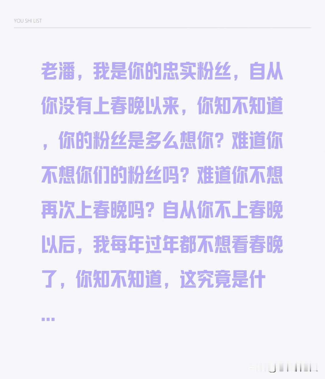 老潘,我是你的忠实粉丝,自从你没有上春晚以来,你知不知道,你的粉丝是多么想你? 难道你不想你们的粉丝吗?难道你不想再次上春晚吗?自从你不上春晚以后,我每年过年都不想看春晚了,你知不知道,这究竟是什么原因吗?因为没有了你,我就不看了,我要看春晚,就想看你的《过河》那样高水平高质量的节目,没有你的节目,很难给我们带来欢乐,所以我们干脆不看了。 请问,你为什么这么狠心呢?为什么你舍得你的忠实粉丝呢?你为什么不喜欢上春晚呢?难道春晚抛弃了你吗?难道你抛弃了你的粉丝是吗?祝愿你2026年中央电视台的春节联欢晚会上能够看到的节目!祝你新年快乐!@潘长江
