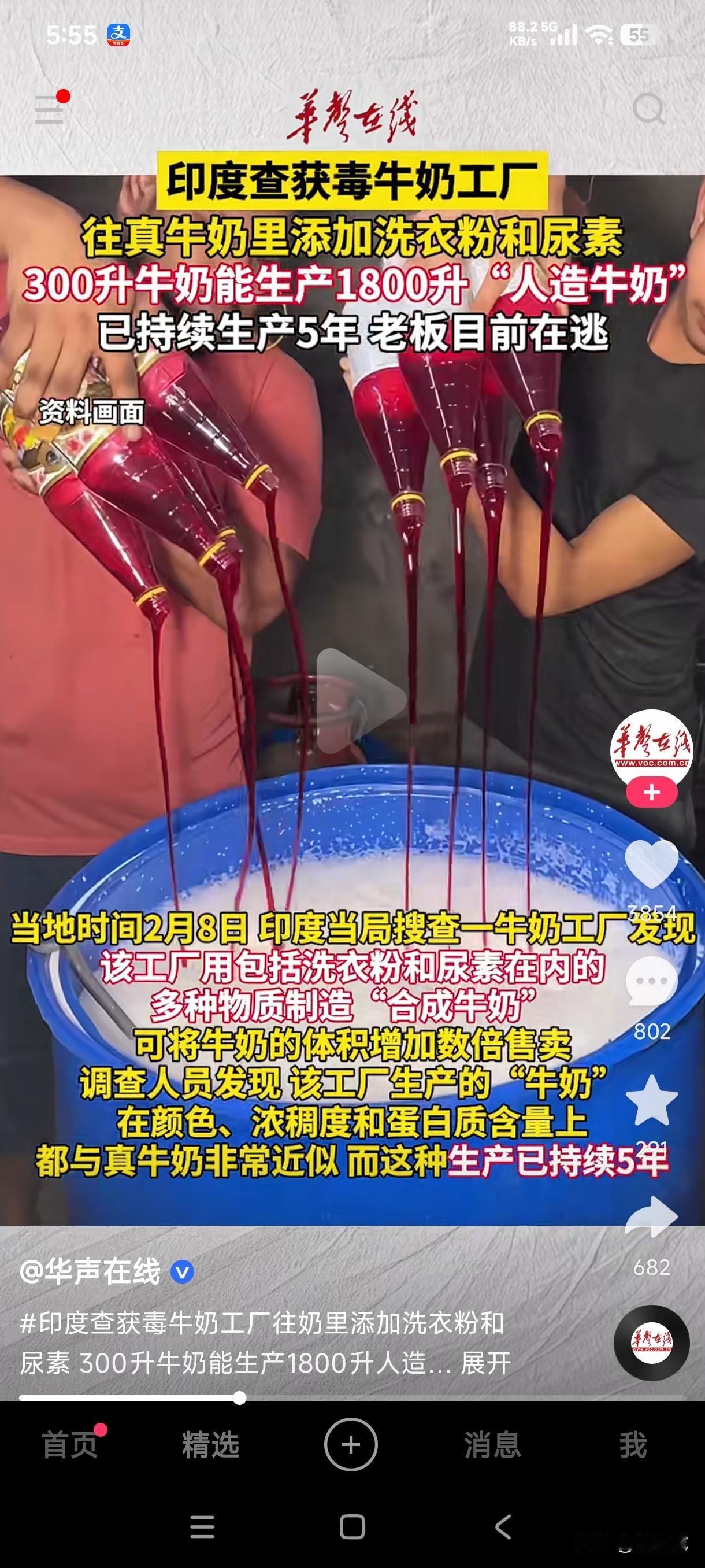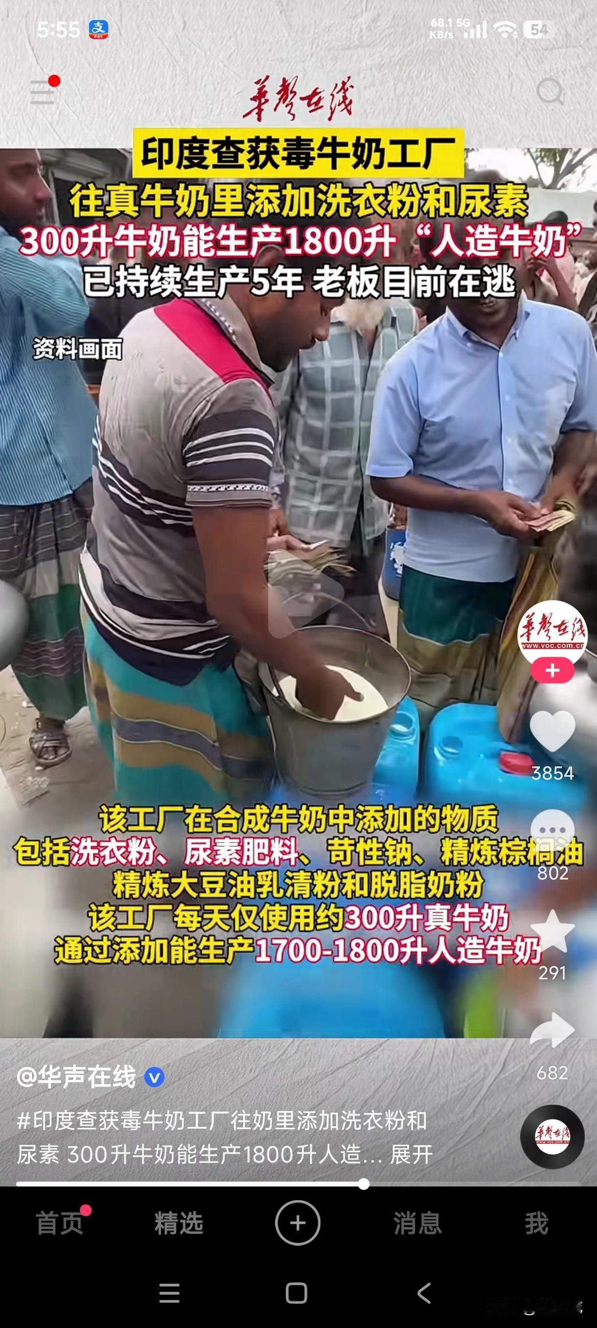 我严重怀疑印度毒牛奶工厂是以前的三鹿奶粉老板创建的,有人说印度没有造假的产品,这不印度查获毒牛奶工厂,往真牛奶里添加洗衣粉和尿素,300升牛奶能生产1800升人造牛奶。 缺德丧良心的商家哪里都有,这印度人制造假牛奶的事可真是让人开眼了,别人都是往牛奶里面掺水,他们居然往牛奶里面添加洗衣粉和尿素,这洗衣粉是用来洗衣服去除油污的,而尿素是用来种粮食的,这两者八竿子打不着的东西加到里面到底起什么作用?300升的牛奶居然能生产1800升的人造假奶,而且老板已经连续生产5年了,这不得害了多少人,况且这缺德的老板也跑路了,如此丧尽天良的人天打雷劈都不为过。 哪里都有好人坏人,有些人说印度吃的东西都是真材实料的,看看这毒牛奶工厂不是曝光出来了吗?