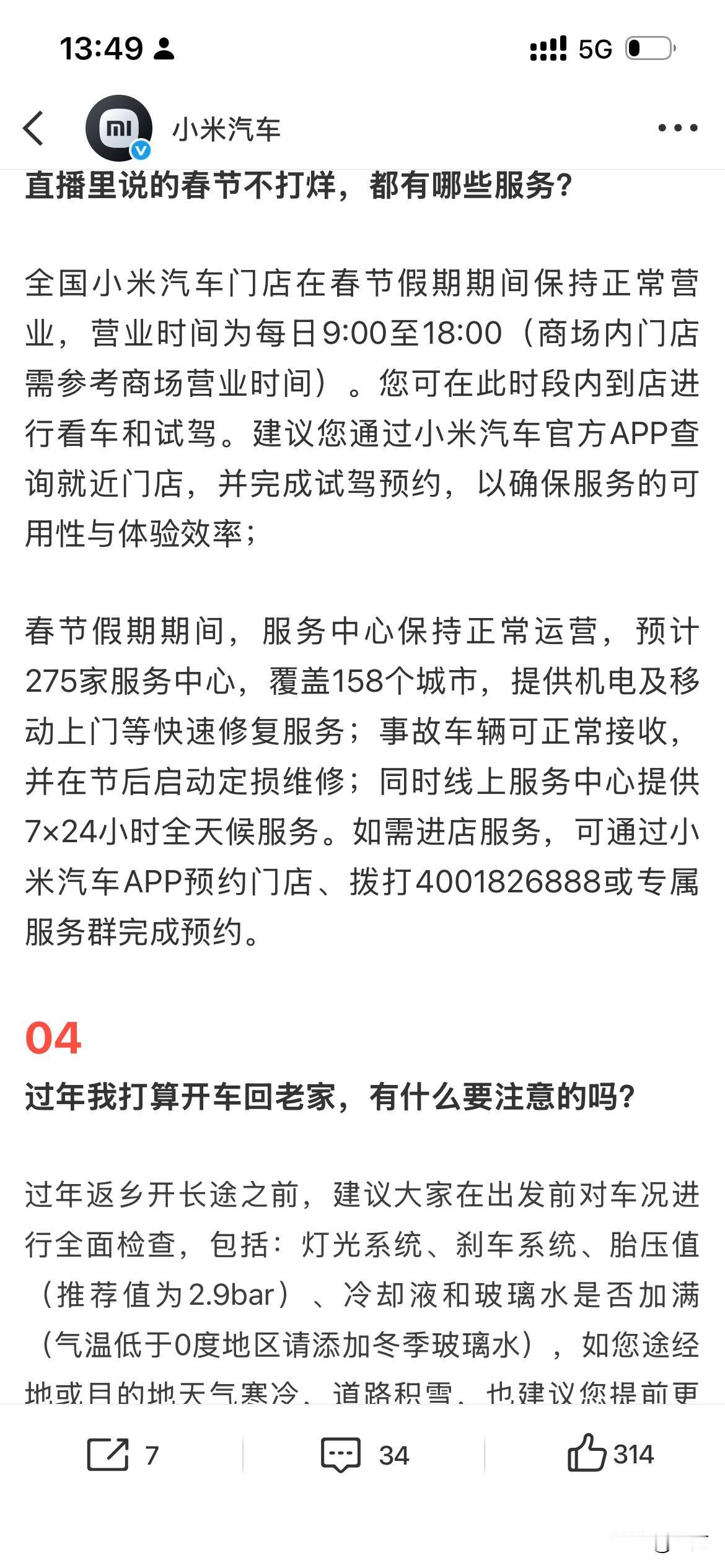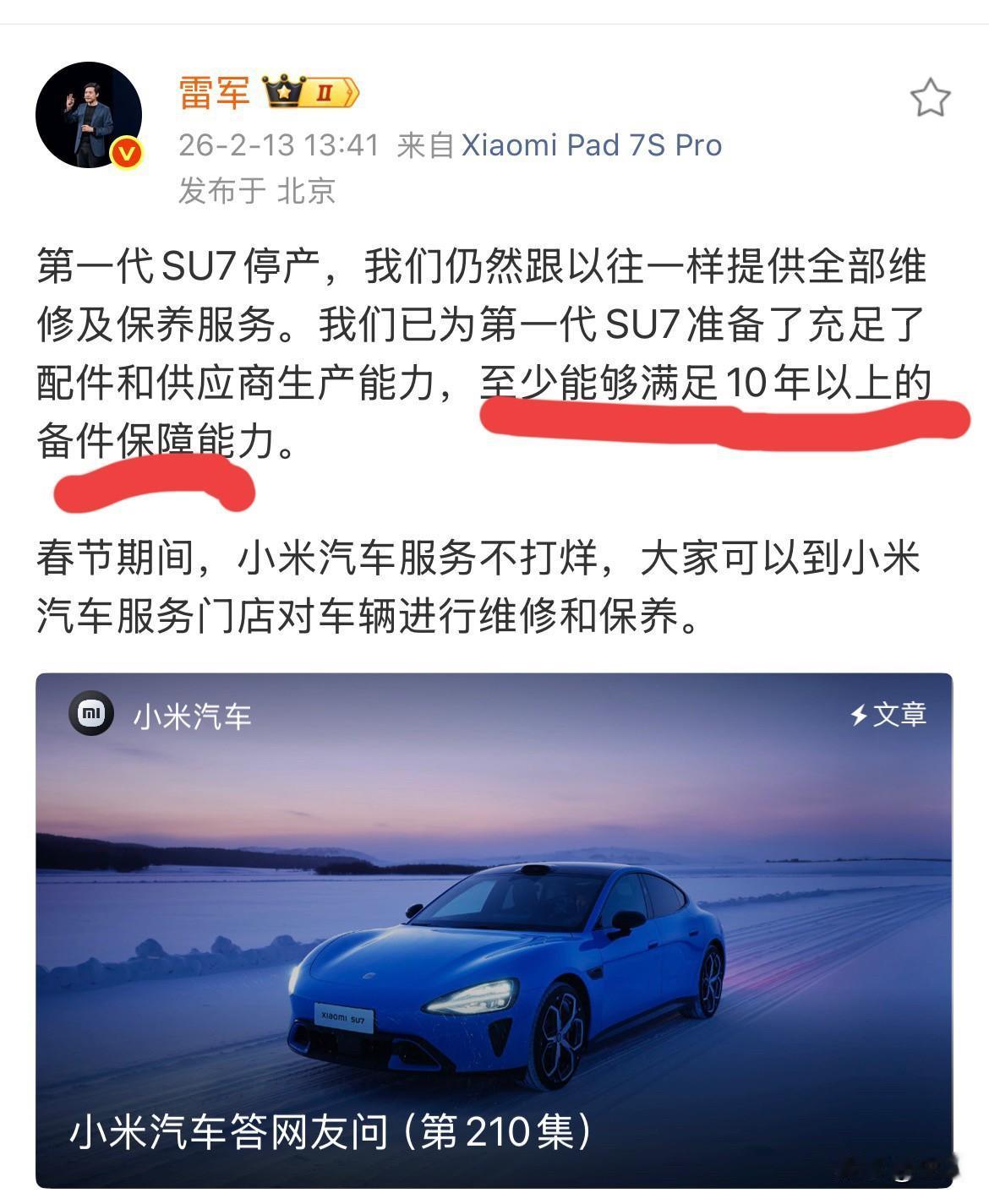 雷军消除第一代小米SU7用户顾虑! 马上小米SU7升级换代的新车就要来了,可能不是所有老车主都会新一代的小米SU7,所以他们可能最多的,就是这个车的保障问题! 所以雷军今天在社交网络,把这部分用户的顾虑做出了承诺,首先他表示,他们已经给第一代小米SU7的配件准备的相当的工作,而且也该供应商做出了相应的生产能力指标,还得继续收钱这些车的配件,而且持续时间要到10年以上,现在是是2026年,也就是说,即便是到了2036年,小米SU7第一代产品也有新的配件! 所以这一部分用户,大可不必担心后期这个车的维护和保养,以及在维修方面可能存在的配件问题,而且小米既然把这个车的配件供应能力时间保证的这么久,后续效应的车型,比如小米的SUV,以及马上就要出来的小米全尺寸SUV,按照这个服务去往下面走。 所以解释大家在购买汽车产品的时候,非常在意的一点,那就是一定要买一个比较大的公司的产品,大家用比较简单的逻辑来看这个事情,就是这个品牌,它的存在时间要有足够的长,那么相应的服务才能够跟得上。