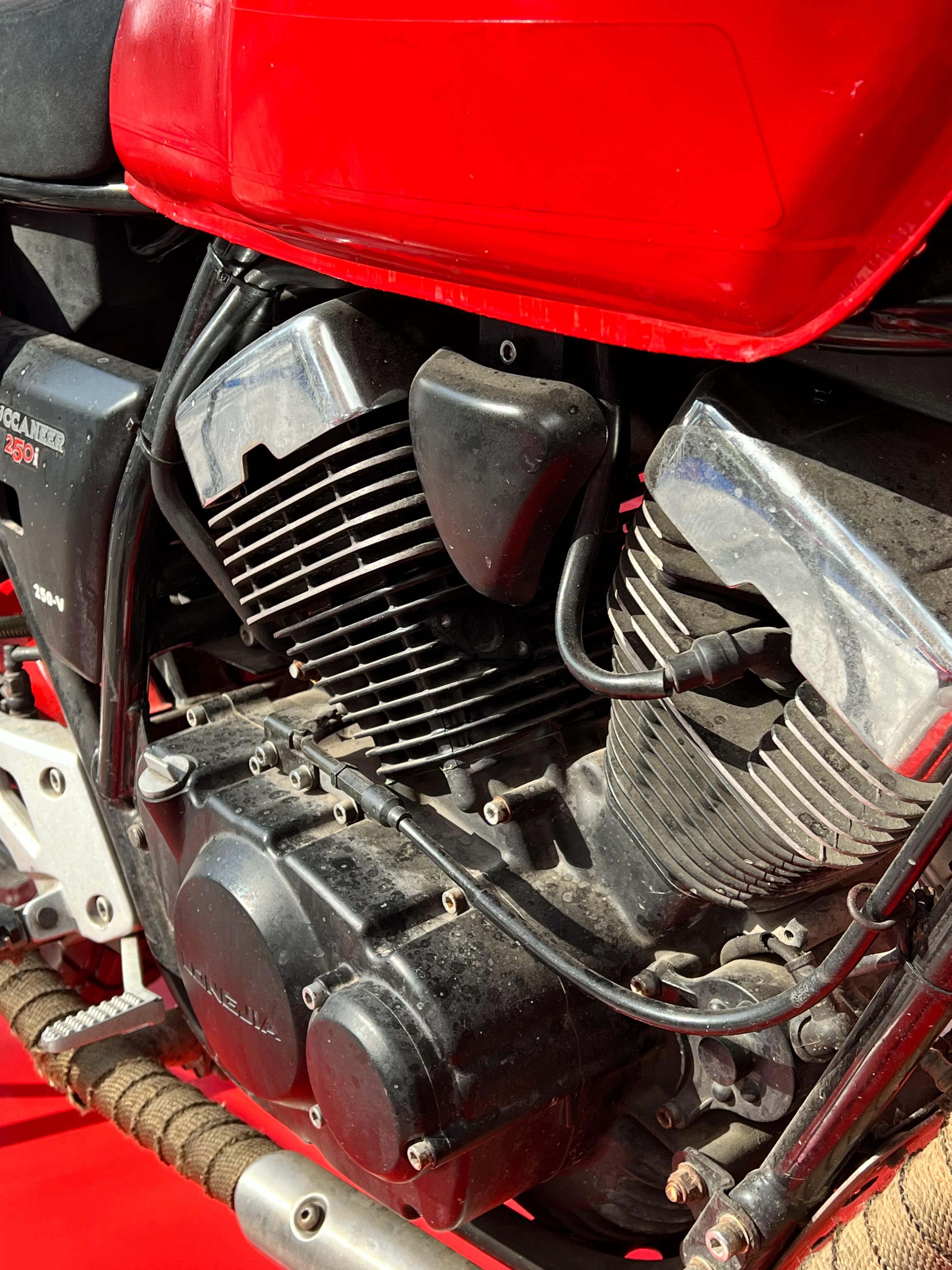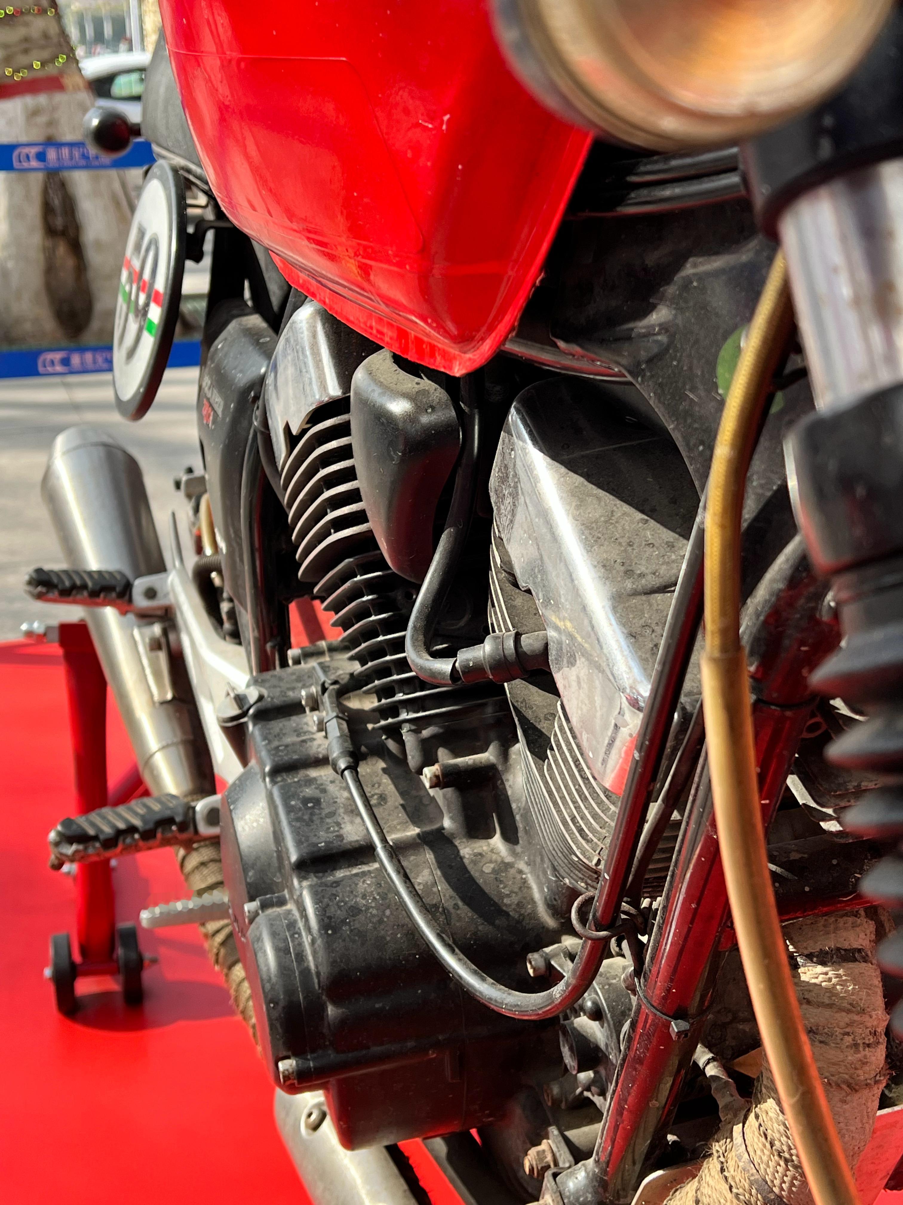 邯郸新世纪门口摆了几个老款摩托车这是一个本田的双缸,发现一个有趣的设计,它的V型双缸从正面看是错开排列的,一左一右,我觉得这是为了气缸的散热吧。很有意思的设计 邯郸·新世纪商业广场西楼