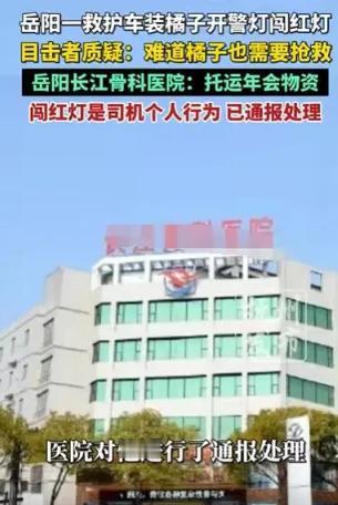 湖南岳阳,一辆救护车从男子身边呼啸而过,男子看了一眼,发现救护车里装的是橘子,司机却拉着警灯,闯红灯,男子很惊讶,难道橘子也要抢救,对此医院回复,说他们是民营医院,闯红灯是司机的个人行为,现在已经通报处理,取消他年终优秀员工奖。 2月10号那天,湖南岳阳一位市民正开车等红绿灯,突然听到身后传来一阵鸣笛声,从后视镜里一看,是一辆闪着警灯的救护车,正急匆匆地往前开。 他没多想,下意识就往路边挪了挪车,乖乖停在原地等红灯,毕竟救护车这东西,大家都知道是用来救急的,耽误一秒都可能关乎一条人命,主动避让是每个司机的本能。 可就在这辆救护车从他身边呼啸而过的瞬间,他无意间瞥了一眼车厢,整个人都愣住了,救护车里压根没有躺着急需抢救的病人,满满一车装的都是橘子。 他当时就懵了,心里满是疑惑和气愤,这救护车是用来运送病人的,怎么改成运橘子了? 更让人想不通的是,就为了运一车橘子,居然还开着警灯,闯着红灯,难道这些橘子也要抢救,有什么生命危险吗? 气愤之下,他拿起手机拍下了这一幕,后来这件事被报道出来,一下子就引发了很多人的关注和讨论。 大家之所以这么不满,从来都不是针对一车橘子,而是针对救护车被滥用这件事本身,更针对这种无视规则、辜负信任的行为。 很多人可能都有过这样的经历,在路上开车,只要听到救护车的鸣笛声,看到闪烁的警灯,不管是在等红灯,还是在正常行驶,都会第一时间主动避让,哪怕自己多等几分钟、多绕一段路,也心甘情愿。 人们愿意这么做,不是因为害怕,也不是因为有什么强制要求,而是发自内心的善良,是对生命的敬畏。 大家都清楚,救护车里可能躺着急需救治的病人,每一秒的耽误,都可能让一个生命陷入危险,每一次的避让,都是在为生命争取时间,都是在守护一个家庭的希望。 可岳阳这件事里,人们下意识避让的救护车,拉的却是一车无关紧要的橘子,那些主动让出来的时间和道路,没有用在拯救生命上,反而成了医院运送年会物资的“捷径”,这种反差,怎么能不让人寒心、不让人不满。 事件发酵后,涉事的岳阳长江骨科医院给出了回应,说他们是民营医院,那辆救护车是院前转运综合车,不是专用的急救车,这次用来拉橘子,是为了运送医院年会的物资。 至于救护车开警灯、闯红灯的行为,医院则表示,这是司机的个人行为,和医院没关系,他们已经对这名司机进行了通报处理,还取消了他的年终优秀员工资格。 可这样的处理结果,不仅没有平息大家的不满,反而引发了更多的质疑。 大家质疑的,首先就是医院的责任推卸,平时要是司机出了什么功劳,肯定会算在医院头上,可一旦出了问题,就把所有责任都推给司机个人,说这是“个人行为”,这种“立功算单位、出事算个人”的做法,实在让人无法接受。 再者,很多人都在疑惑,就算那辆车是院前转运综合车,不是专用急救车,它也是印着急救标志,能使用警灯的特殊车辆,怎么就能随便用来拉橘子? 而且,医院给出的处罚也太过轻微,仅仅是通报处理、取消年终优秀员工资格,这样的处罚,根本起不到任何警示作用,也看不出医院的诚意。 大家真正在意的,从来都不是要严惩这名司机,而是希望医院能正视自己的问题,规范救护车的使用,不要再让这种滥用特权、辜负信任的事情发生。 守住生命通道的纯洁性,就是守住每个人对生命的敬畏,守住人与人之间的信任。