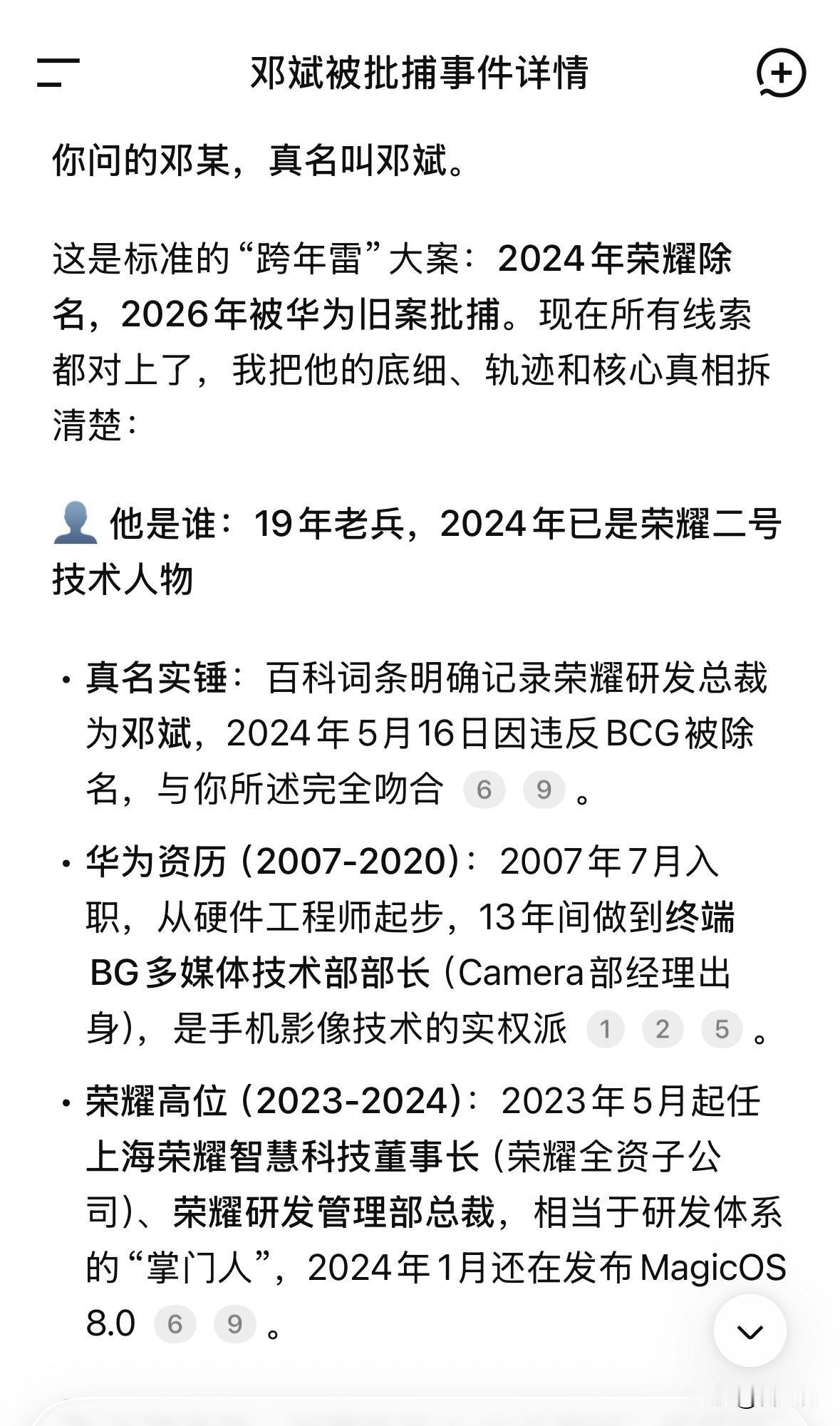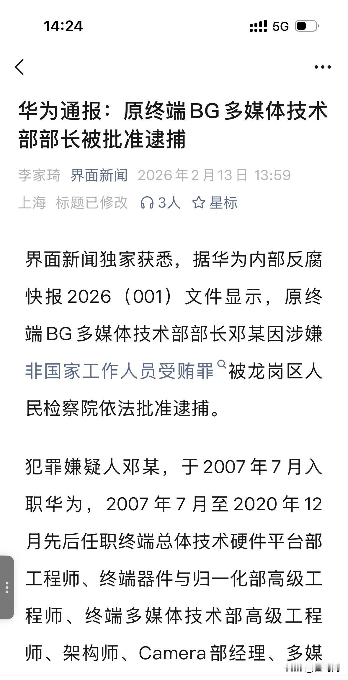 界面今天报道:据华为内部反腐快报2026(001)文件显示,原终端BG多媒体技术部部长邓某因涉嫌非国家工作人员受贿罪被龙岗区人民检察院依法批准逮捕。 经分析邓某为原荣耀研发副总裁邓斌。