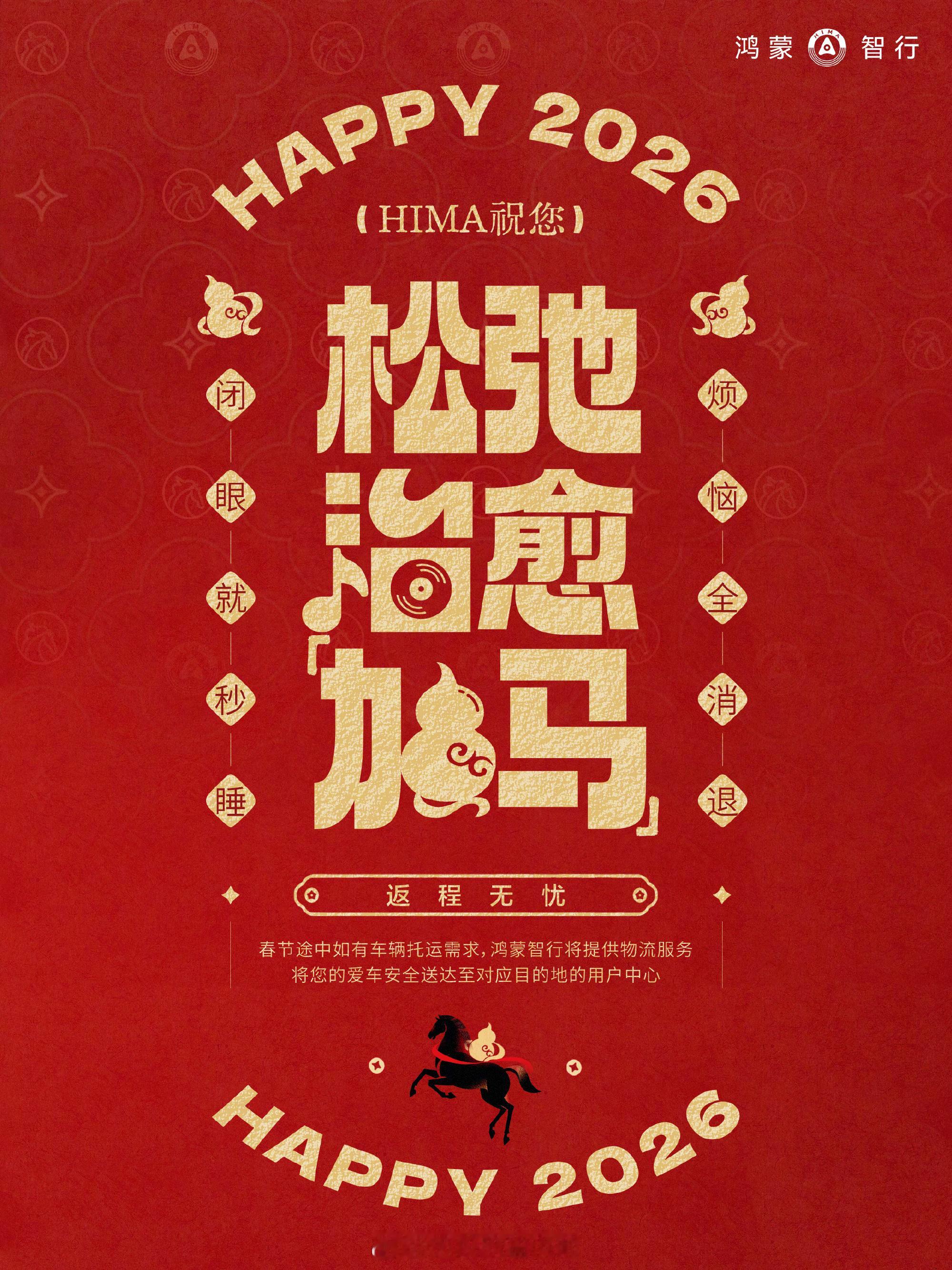 鸿蒙智行马年春运保障政策加码:1、进店免费进行15项安全检测;2、进店免费添加车辆玻璃水;3、缺油缺电,免费拖车服务;4、提供车辆托运物流服务;5、春运期间不限次数道路护航;6、道路护航后续服务,提供住宿或继续旅行服务;7、鸿蒙智行门店春节期间不打烊。鸿蒙智行春运安心加马鸿蒙智行享界s9t