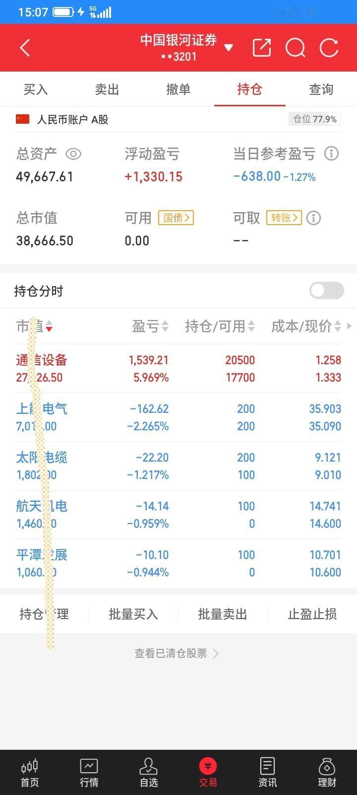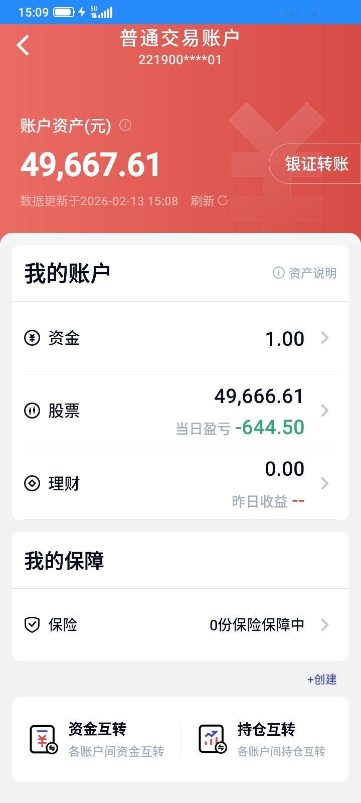 2026.02.13,春节前的最后一个交易日,又是大亏的一天,总是太贪心,上涨的不敢买,忍不住买入了就下跌了,一错再错,又亏多了。 上能,昨天很不想补仓的,最后一分钟没有忍住,想搏反弹,补仓了100股,今天竟然低开,反弹,但是反弹一点点,下午逐步下跌,收盘还又跳水,多亏了160多块钱。 太阳今天低开慢慢反弹,又贪心了,昨天赚几块钱,觉得买对了,但是买得太少,要乘胜追击,于是今天以9.12再补仓100股,但是今天没有那么好运了,买入之后就下跌,从赚钱到倒亏了十多块钱。 按照规则,今天太阳,上能都该卖掉,但是马上是长假,可能节后会大涨,就不按规则了,今天都不卖了,春节后再重新执行规则吧。 早上看到平潭高开高走,以前就想买,现在跌下来了,便宜多了,于是上午委托10.70买入100股,但是一直没有下跌,没有成交,下午终于跌下来了成交了,买不到的才是好东西,买的到就成垃圾了,买到之后就下跌,又多亏了十块钱。 以前航天没有追上,一直上涨,错过了,现在跌下来了,没有人要了,我觉得人弃我取,今天高开高走,然后回落,应该是好的买入时机了吧,至少比以前便宜呀,早上回落中以14.74买入100股航天,成交之后没有下跌,还以为买对了,但是下午还是下跌,又亏了十多块钱。 持有的etf下跌,还是网格交易,下跌就买入,下跌了0.025,收盘还拉起来0.001,收盘以1.333买入2800股。涨跌只是浮盈浮亏,上涨卖出,下跌买入,赚波动的差价,才是实实在在的。期望春节后好运吧。 今天转出5000块,把借呗的5000元免息30天的网贷还了,今天总市值3.8666万元,是个吉利的数字,总资产4.9667万元,也是不错的。今天大亏644元,这个月最终没有摆脱亏损的命运,亏了450多块钱,下午春节后赚回来吧。