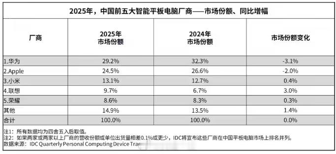 IDC发布了2025全年以及Q5国内平板电脑市场数据1、全年整体出货量3376万台,同比增长13.1%;2、全年排名:华为、苹果、小米、联想、荣耀;3、Q4排名:苹果、华为、联想、小米、荣耀。PS:vivo与OPPO平板也不少且产品也不错,怎么就冲不进前五呢?
