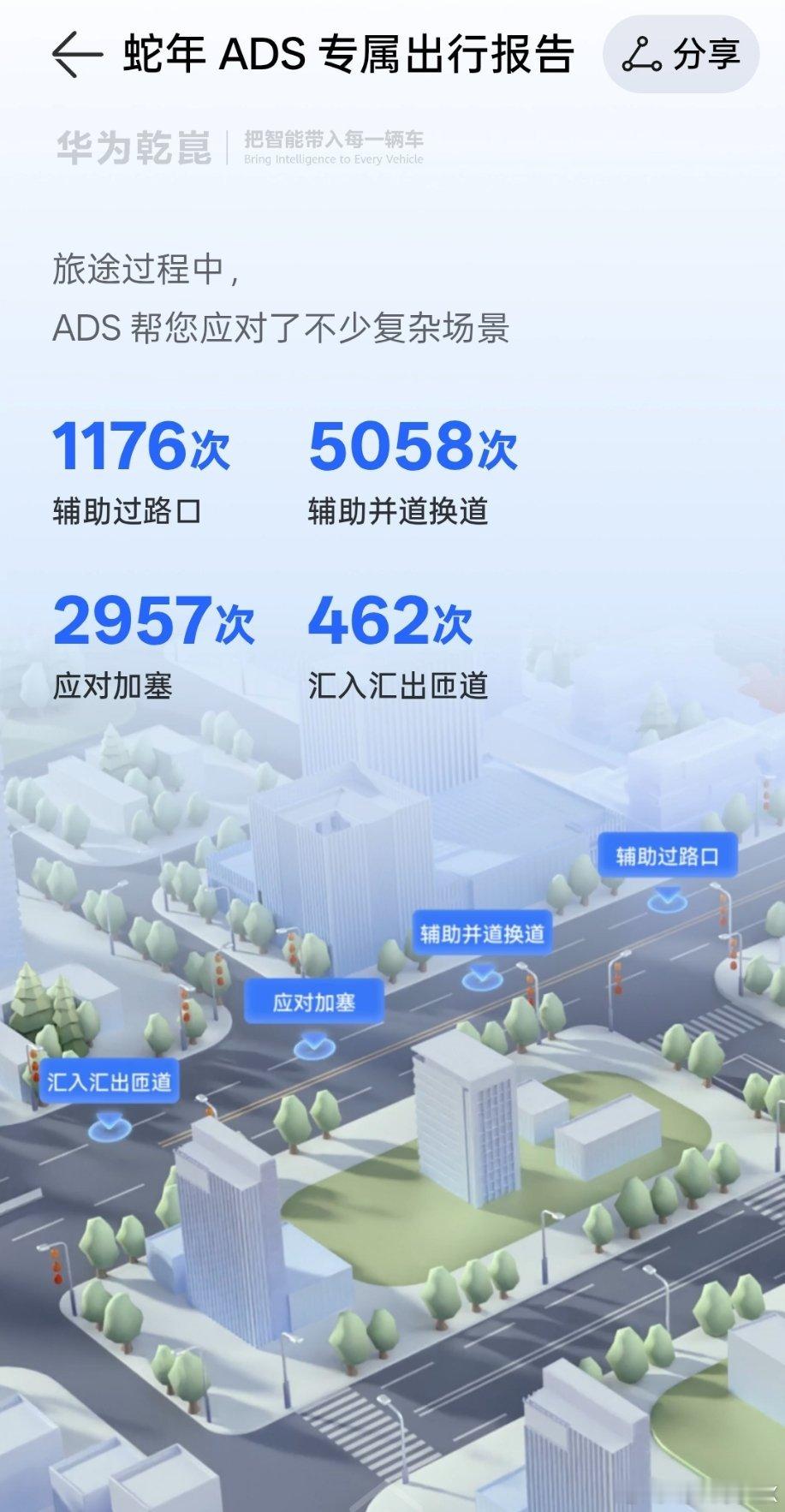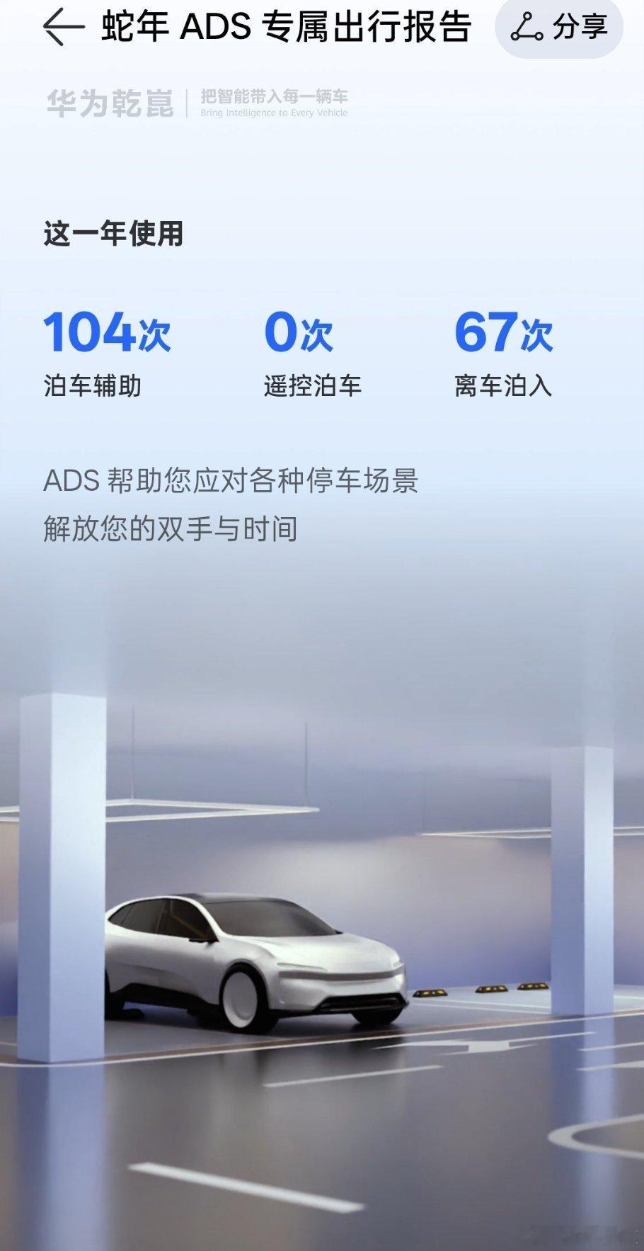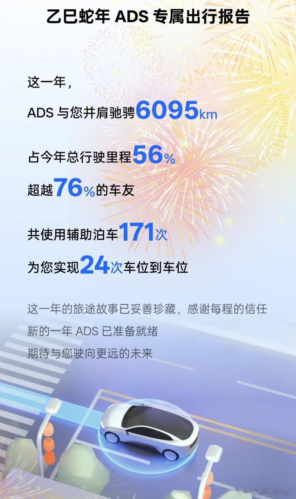 收到华为乾崑 蛇年ADS专属出行报告的推送,愣了一下,这怎么ADS也会给我写信。6095公里,ADS开的,占今年总里程56%,超过76%的车友。其实印象最深的是那个104次辅助泊车——不是我懒,是现在的车位画得越来越像科目二考场。我下车,它表演,这多方便。还有24次车位到车位,它比我认路,从地库抬杆就开始自己干,那我乐得只当个监工。 刚好赶上ADS 4.1升级。说人话就是:以前是“它能干”,现在是“它敢干且干得顺”。以前年度报告是音乐App告诉你听了多少小时,外卖App告诉你点了多少单。 现在是华为乾崑告诉你:这一年,你其实没开多少公里。挺好的,被科技惯坏,也不是什么丢人的事。 评论区一起晒出你的ADS出行报告看看吧!