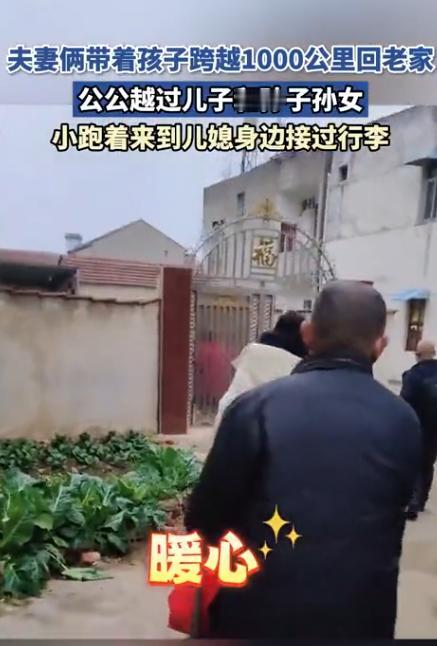 暖心到破防!湖北夫妻带娃跨1000公里返乡,公公的举动看哭众人 2月10日,正是春运返乡的高峰期,全国各地的游子们,都在朝着家的方向奔赴,湖北的街头巷尾,早已被浓浓的年味儿包裹,家家户户都在忙着打扫卫生、准备年货,盼着远方的亲人早日归来。 这对夫妻,常年在外地打工谋生,平日里很少有时间回老家,孩子们也只能趁着春节,才能回到爷爷奶奶身边,好好团聚一段时间。 为了能早点到家,和家人团聚,夫妻俩提前几天就收拾好了行李,打包了在外打拼攒下的心意,还有给老人、孩子买的新年衣物和年货,满满当当装了大半个后备箱。 他们带着两个孩子,一大早就出发,开启了1000公里的返乡之路,全程以高速为主,路途遥远且枯燥,再加上春运期间高速拥堵,一路上走走停停,原本预计十几个小时的路程,硬生生走了近二十个小时。 天色渐渐暗了下来,夫妻俩终于驾车抵达了老家村口,远远就看到了站在自家门口等候的公公婆婆。 车子缓缓停下,夫妻俩连忙下车,一边招呼着老人,一边转身去抱车里的孩子。两个孩子一看到爷爷奶奶,瞬间就不哭不闹了,兴奋地伸着小手,嘴里含糊地喊着“爷爷、奶奶”,挣扎着想要从车里下来,奔向老人身边。 儿子率先走过去,想要和父亲打招呼,顺便接过老人手里的东西,可让他没想到的是,父亲根本没有停下脚步,也没有看他一眼,目光紧紧锁定在刚下车、手里还拎着行李的儿媳身上,脸上满是心疼。 紧接着,公公迈开脚步,小跑着朝着儿媳的方向走去,脚步有些急促,甚至还有些踉跄,看得出来,他是真的着急想要快点走到儿媳身边。 儿媳刚把手里的一个大行李箱拎下来,还没来得及站稳,公公就快步走到她身边,不由分说地接过了她手里的行李箱,又顺手拿走了她胳膊上挎着的背包,动作轻柔又麻利,生怕让儿媳多累一秒钟。 他一边接过行李,一边下意识地打量着儿媳,眼神里满是关切,看着儿媳满脸疲惫的模样,眼底的心疼藏都藏不住。 儿媳看着公公小跑着接过自己手里的行李,看着他略显佝偻的背影,还有他手里沉甸甸的行李箱,心里瞬间一暖,眼眶也忍不住湿润了。 她知道,公公一直都很疼她,自从她嫁过来,公公就从来没有让她干过重活、受过大委屈,哪怕她常年和公公婆婆分开居住,这份疼爱也从来没有减少过,就像对待亲生女儿一样。 公公抱着沉甸甸的行李箱,虽然有些吃力,手臂都微微有些弯曲,可脸上却始终挂着笑容,一边往家里走,一边不停地叮嘱儿媳,让她慢点走,累了就歇一歇,不用着急,家里什么都准备好了,饭菜也都还是热的,等她歇够了就开饭。 据悉,这段时间,正是春运返乡的高峰期,像这样暖心的团圆场景,在湖北的各个乡村、城镇不断上演。很多游子跨越千里,只为回到家人身边,和家人好好团聚, 而家人们的等候和疼爱,就是游子们最坚实的后盾,也是他们一年到头,最期盼、最温暖的归宿。对此,你们有什么看法,欢迎评论留言~