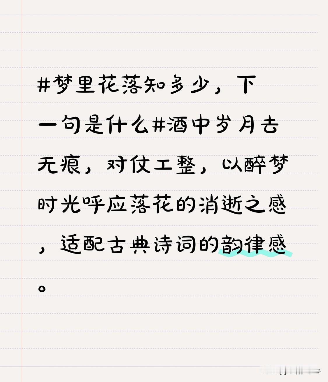 梦里花落知多少,下一句是什么酒中岁月去无痕,对仗工整,以醉梦时光呼应落花的消逝之感,适配古典诗词的韵律感。