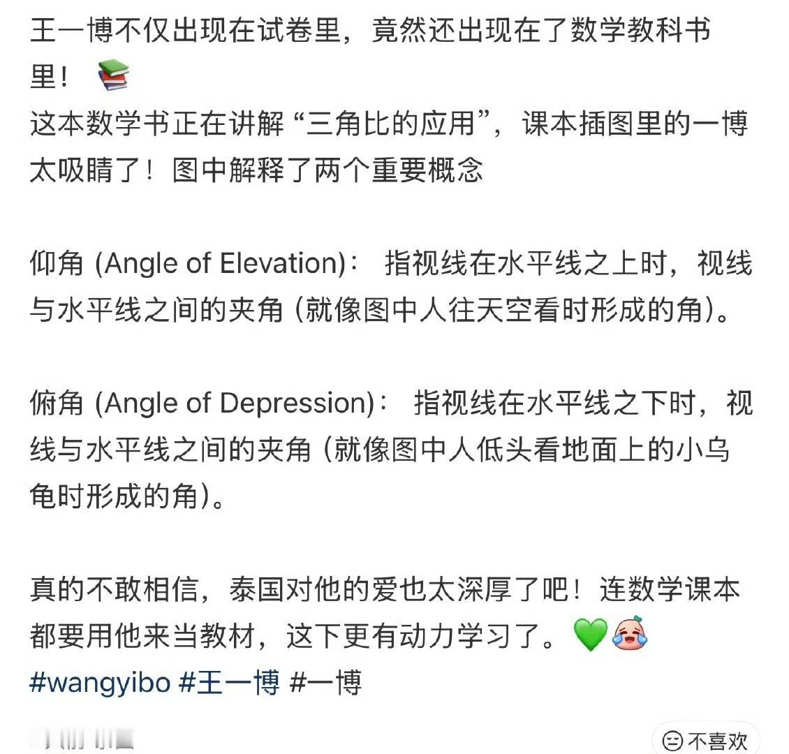 见过很多次王一博出现在考题中试卷中,还是第一次看到王一博出现在教科书里[捂脸]还是泰国的数学教科书。 王一博在泰国的知名度可谓家喻户晓了吧? 王一博的🔥,是实实在在的🔥,是不分国家区域大众喜闻乐见的🔥。
