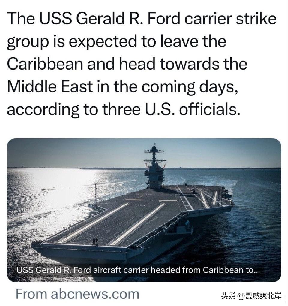 据三名美国官员透露,福特号航空母舰打击群预计将在未来几天离开加勒比海,前往中东地