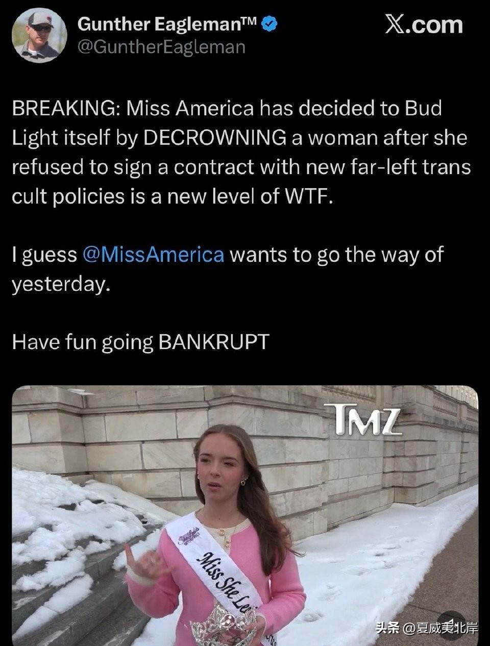 突发消息:美国小姐选美比赛决定自毁声誉,就像百威淡啤(Bud Light)那样——在一名女性拒绝签署包含极左翼跨性别邪教政策的新合同后,主办方剥夺了她的头衔。这简直刷新了离谱的下限。 我猜@MissAmerica 是想彻底过气。 祝你破产愉快!