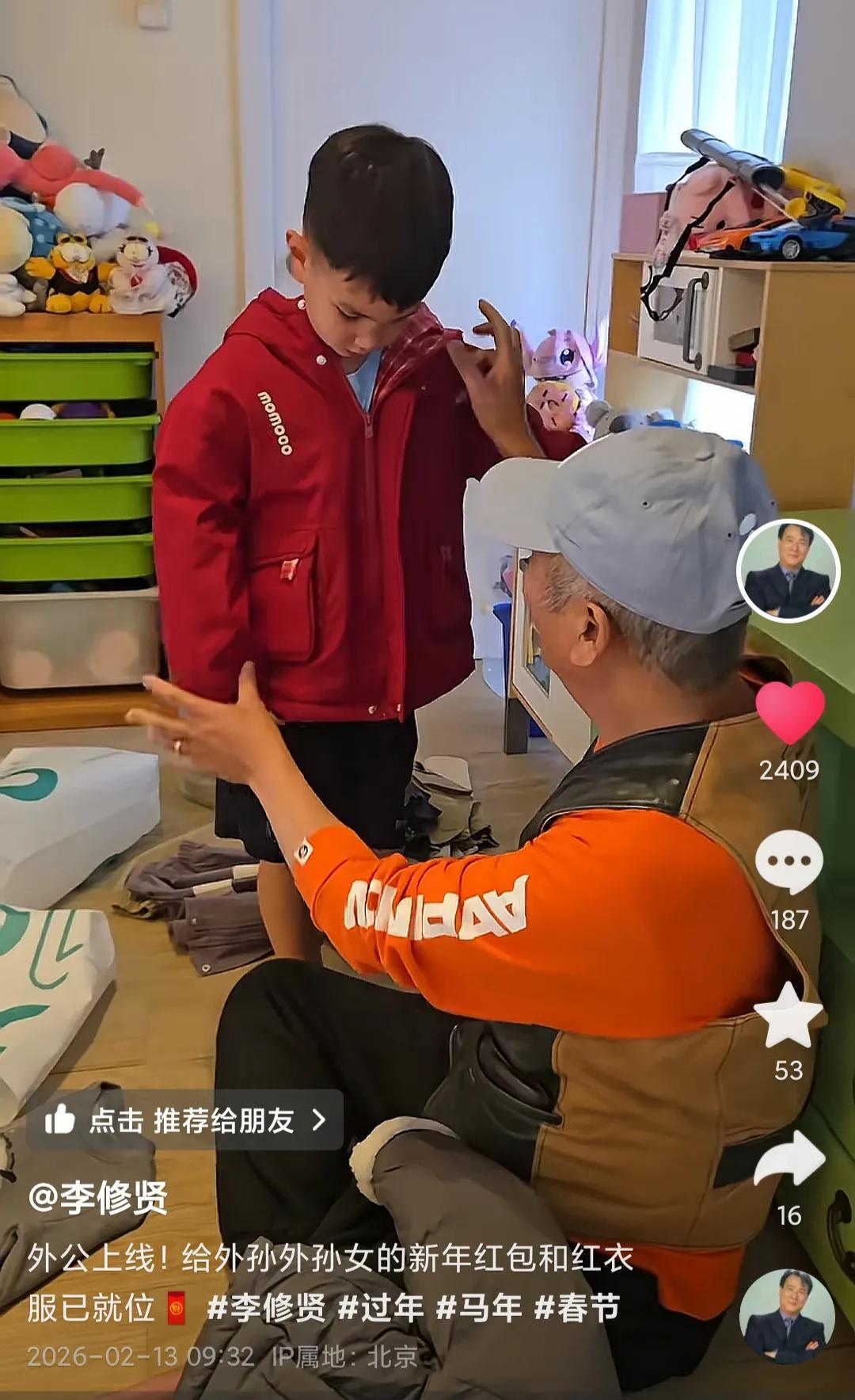 李修贤送新衣服给外孙们过大年!3个混血宝贝穿红衣很喜庆 2月13日,73岁李修贤在个人社交账号发布了一段视频,并配文称,外公上线了,给外孙外孙女的新年红包和红衣服已就位。 李修贤很早就与圈外人结婚,婚后育有一女,女儿嫁给了一名白人,先后生了3个孩子,其中俩娃是龙凤胎。 李修贤很宠爱外孙们,之前更搬到加拿大照顾他们。 适逢春节,李修贤按照传统,给外孙们送去新衣服以及红包。每个宝贝都收到了好几件衣服,很是开心,纷纷拥抱亲吻外公。 李修贤特意给宝贝们准备了喜庆的红色外套,可爱的宝贝们穿得红彤彤,实在太萌了。 最后,祝福大家春节快乐,万事如意!