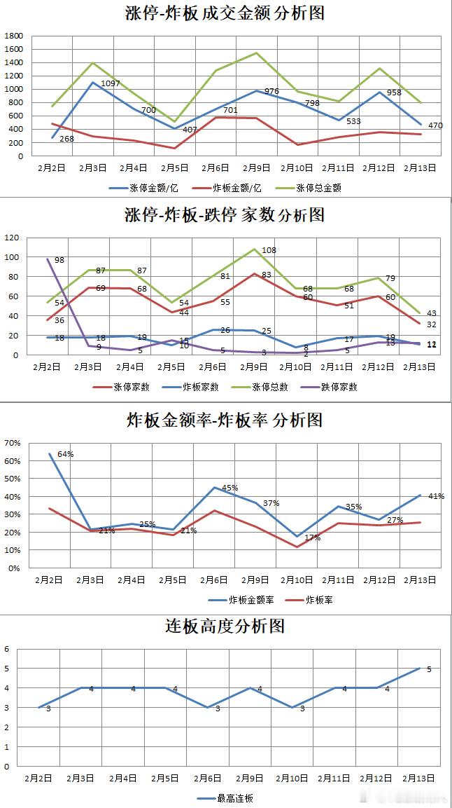 【2.13星期五】 湖南人涨停复盘 "涨停金额:470亿 炸板金额:323亿首板金额:417亿 连板金额:53亿涨停32家 炸板11家 跌停12家首板27家 连板5家" 【市场连板股】5只 53亿 代码 名称 末次时间 连板数 原因603533 掌阅科技 9:32 5 AI应用001896 豫能控股 9:25 3 算力605033 美邦股份 9:25 3 农药002951 金时科技 9:54 3 光通信002498 汉缆股份 9:43 2 海缆【半导体】4只 106亿 消息面:AI服务器需求爆发驱动DRAM与逻辑芯片资本开支高增 600629 华建集团 9:53 1 间接持股上海微电子603163 圣晖集成 10:18 1 半导体洁净室000859 国风新材 10:32 1/4天2板 光刻胶000021 深科技 14:46 1 存储封测【算力】4只 72亿 消息面:智谱上调GLM Coding Plan价格,整体涨幅30%起 001896 豫能控股 9:25 3 拟参股先天算力002843 泰嘉股份 9:50 1 数据中心电源600410 华胜天成 10:15 1 火山引擎605289 罗曼股份 13:17 1 算力【光通信】3只 23亿 消息面:美股科技巨头资本开支超预期;CPO、OCS频出大单 002951 金时科技 9:54 3 光纤通信300812 易天股份 10:15 1 光模块000890 法尔胜 11:19 1 光通信【机器人】3只 51亿 603331 百达精工 9:45 1 合作银河通用+机器人002009 天奇股份 13:26 1 银河机器人603960 克来机电 14:40 1/4天2板 机器人【军工】3只 77亿 601890 亚星锚链 9:44 1 海军锚链300719 安达维尔 10:43 1 军工600893 航发动力 13:59 1 航空发动机【无人驾驶】3只 35亿 002703 浙江世宝 10:14 1 自动驾驶(线控转向)002355 兴民智通 11:04 1 无人驾驶601777 千里科技 13:49 1 无人驾驶【其他热点】 603533 掌阅科技 9:32 5 AI漫剧603466 风语筑 10:25 1/5天3板 即梦AI合作000839 国安股份 9:30 1/4天2板 AI内容审核300449 汉邦高科 10:29 1 数字水印【其他个股】 605033 美邦股份 9:25 3 农药002498 汉缆股份 9:43 2 海缆000798 中水渔业 9:57 1 水产600791 京能置业 9:58 1 房地产605007 五洲特纸 10:02 1 造纸002169 智光电气 10:22 1 公告002510 天汽模 10:34 1 商业航天600984 建设机械 11:15 1 塔机租赁【涨停炸板】11只 323亿 代码 名称 首次时间 涨跌幅 原因300369 绿盟科技 9:40 9.48% AI安全600397 江钨装备 9:39 8.25% 公告000738 航发控制 10:43 7.44% 航天000833 粤桂股份 10:01 6.86% 光伏002467 二六三 9:33 5.31% 算力605136 丽人丽妆 9:32 5.27% AI应用000016 深康佳A 9:37 5.07% 其他002519 银河电子 13:20 4.30% 航天603000 人民网 9:33 4.09% AI安全003018 金富科技 10:20 2.06% 资产重组600589 大位科技 9:25 -4.83% 算力