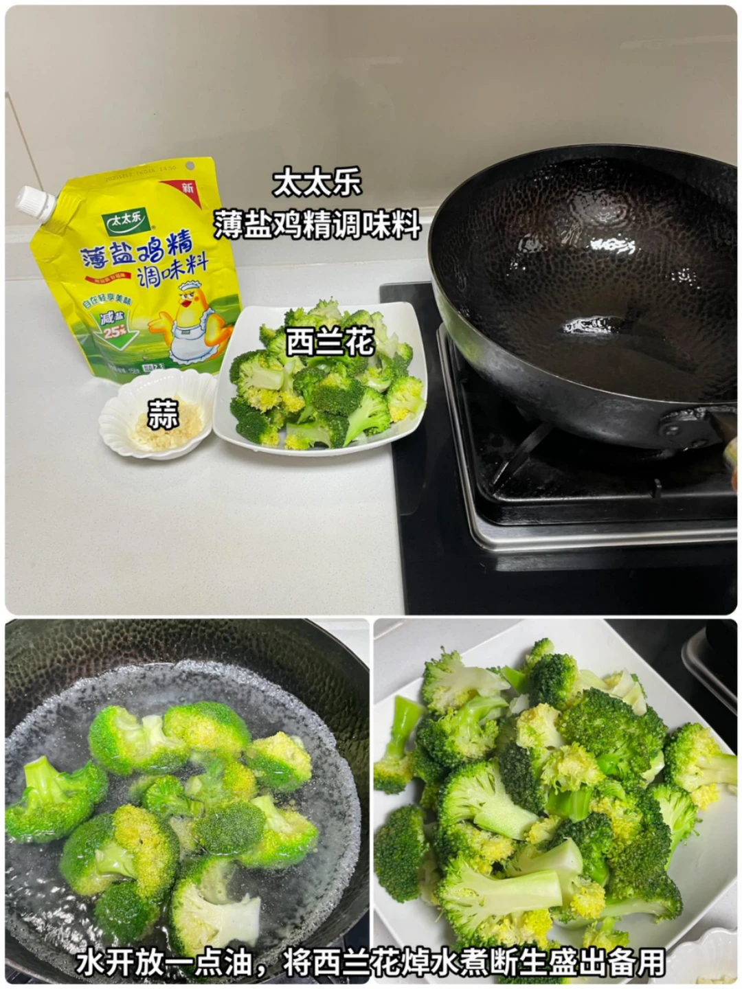 食材:西兰花、蒜末、太太乐薄盐鸡精