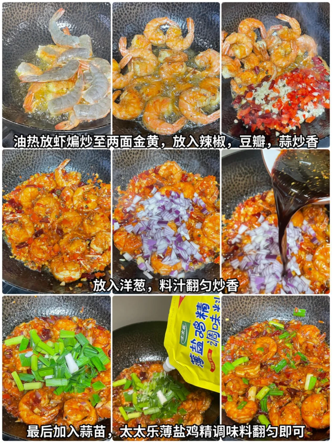 4. 油热炒虾至金黄,扒拉到锅边;爆香配料炒出红油,放洋葱,淋料汁翻炒裹匀,最后加蒜苗+太太乐薄盐鸡精,翻匀出锅