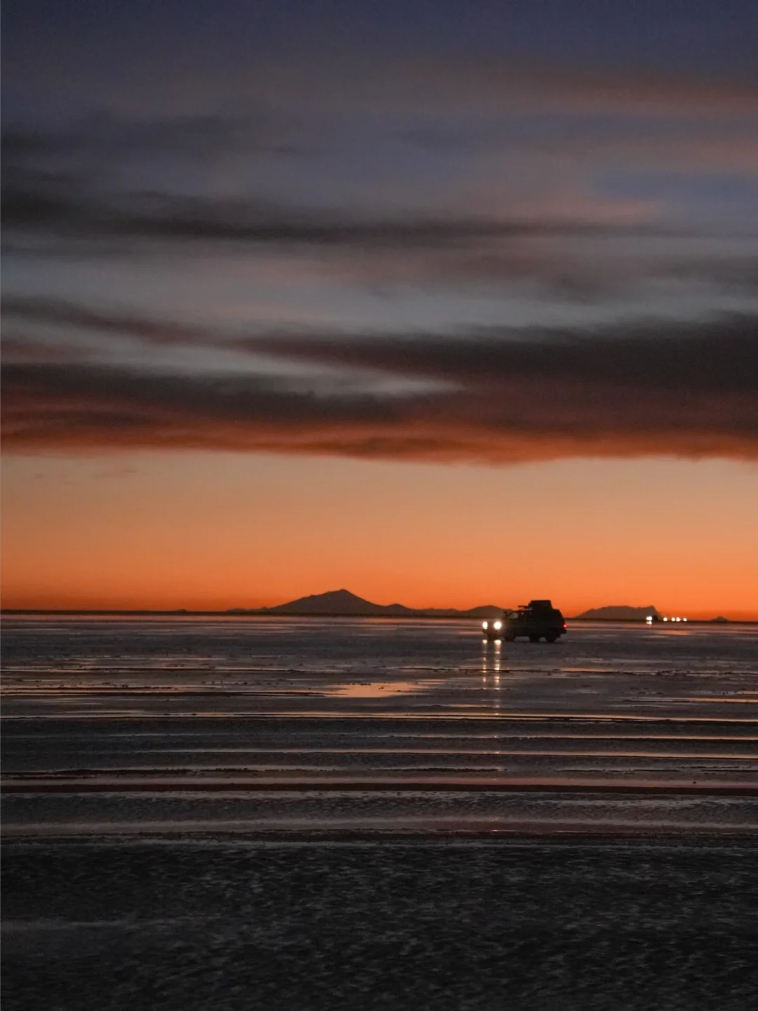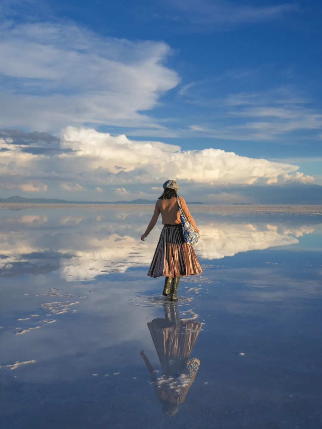 在玻利维亚的乌尤尼,海拔3600+,在雨季形成1万平方公里的盐湖,比茶卡盐湖大100倍。白天只觉得纯净,到了日落简直梦幻,整个人360°被不同的云和色彩包围,这是我人生中最最最美的日落🌅
