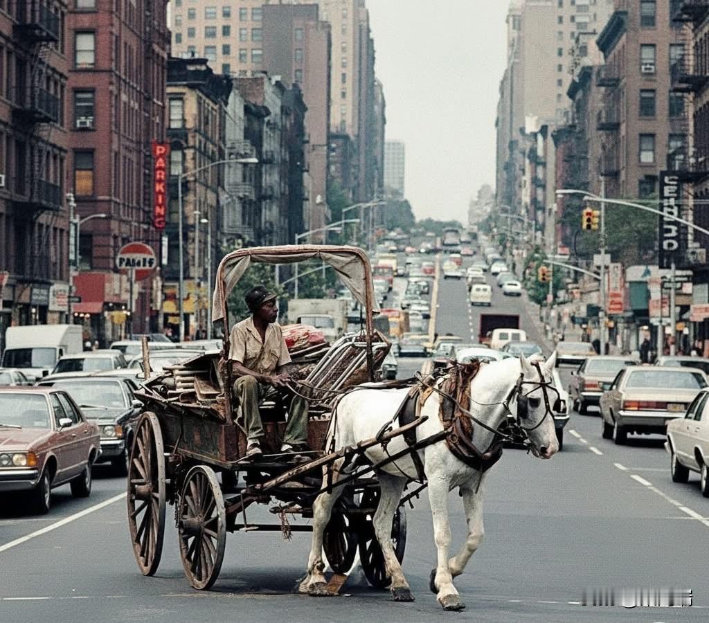 这张照片名为《前往哈莱姆途中》(On the Way to Harlem),由著名摄影师卡米洛·何塞·韦尔加拉(Camilo José Vergara)于1970年在纽约市拍摄。 镜头捕捉了一位废金属收集者驾驶着由白马拉着的马车,在纽约繁忙且充满汽车的街道上行驶的场景。该场景发生在纽约市,当时这名男子正前往哈莱姆区。 韦尔加拉以系统记录城市景观的变化而闻名。这张照片是他 20 世纪 70 年代初纽约街头摄影作品集的一部分,反映了当时城市中新旧交通方式并存的独特景观。
