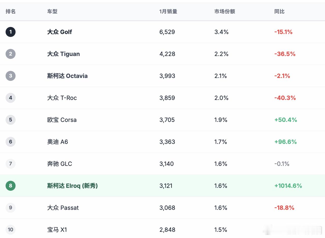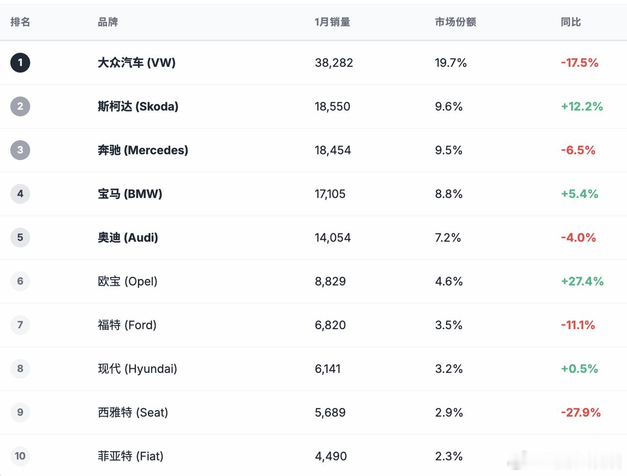 德系品牌内部格局重塑,大众身处产品换代与电动转型阵痛期,销量明显下滑;斯柯达凭借高性价比逆势增长,成为最大赢家。豪华品牌分化明显,宝马表现相对稳健,奔驰、奥迪均有回落。大众旗下车型表现分化,特斯拉市场存在感有所下降,德国市场已成中国品牌向上突围的重要阵地。